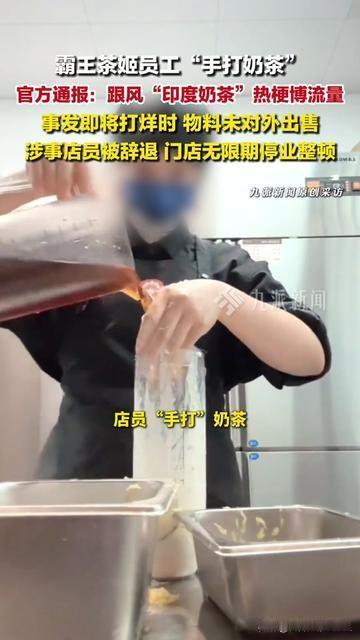 真没想到!喝了三年的霸王茶姬,居然被店员的手打奶茶搞翻车了! 平时买它家,不就图个国风高级感吗?拿在手里都觉得有面儿。 结果有店员为蹭印度奶茶热梗,直接用手打奶茶博流量。 霸王茶姬光速通报:辞退店员,门店无限期停业。 有人说这店员笨,放着品牌的国风优势不用,偏学低俗; 也有人说他急,想快速涨流量冲业绩。 我觉得这哪是博流量?是把品牌的脸往地上踩啊! 好好的国风质感,被这一下搞成low到爆的流量局。 你们觉得他是笨(不懂护品牌)还是急(想走捷径)? 品牌让门店停业,会不会太严?