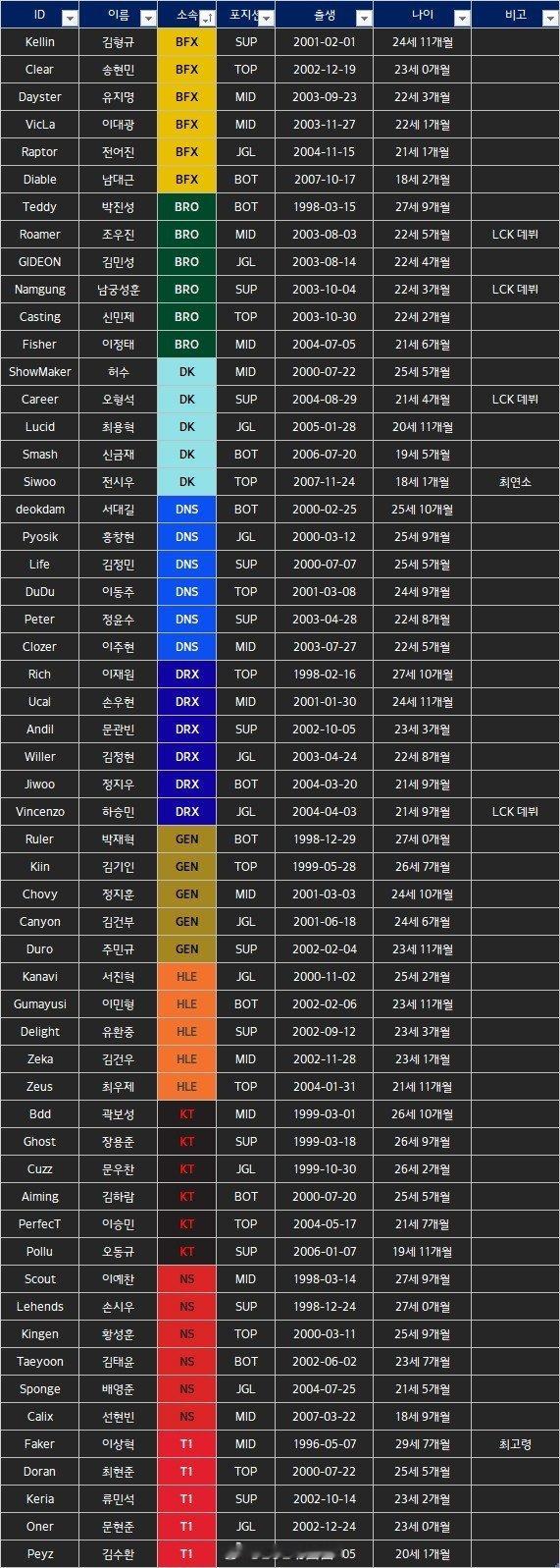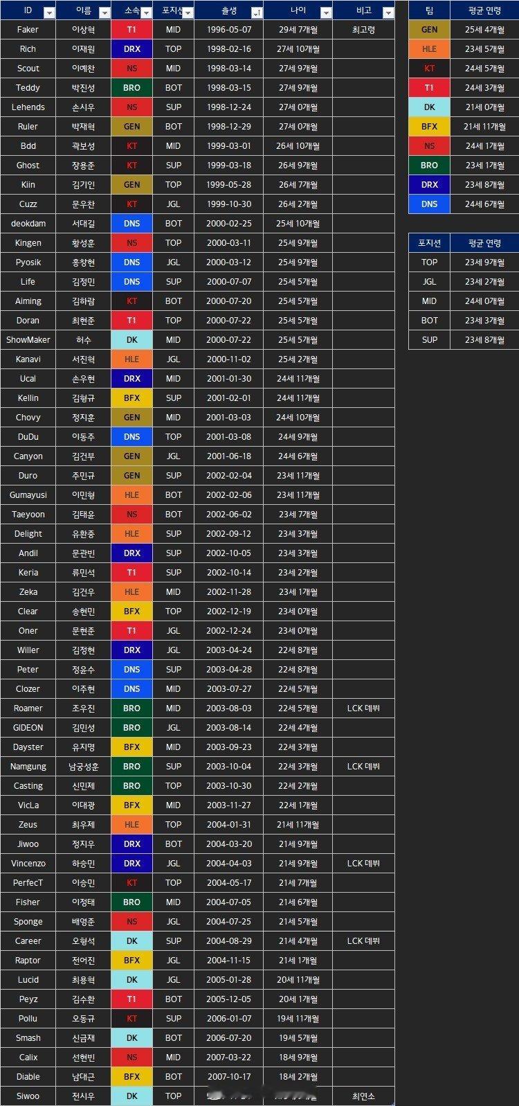 韩网统计了LCK选手年龄表:最年轻的三位是Calix、Diable、SiwooFaker今年居然都三十了,关键是他还在夺冠;Diable、Siwoo两个小将真的打的很好,像小Uzi和Bin哥2026LCK英雄联盟S16英雄联盟