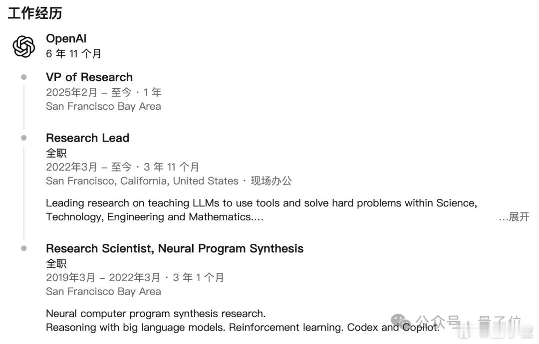 OpenAI推理第一人离职 刚开年,OpenAI再出人事动荡:推理模型第一人离职了!Jerry Tworek——构建o3、o1、GPT-4、ChatGPT以及 OpenAI首个AI编程模型Codex的关键人物,OpenAI研究副总裁——宣布了他的艰难决定:离开OpenAI,去尝试探索一些在OpenAl难以开展的研究领域。他表示,在OpenAI快七年的时间里,经历了许多美好和疯狂的时刻,但更多的是美好的时光。这位推理模型大佬早期从事量化研究,2019年加入OpenAI,是最早一批参与“大规模预训练+算力扩展”路线的研究者之一。2019–2022年间,他在OpenAI做神经程序综合与大模型推理研究,涉及Codex、Copilot这类代码大模型,同时利用强化学习提升复杂任务上的推理与决策能力。2022年起,Jerry开始担任OpenAI的Research Lead,负责带团队研究“如何让大语言模型使用工具、解决STEM领域的困难问题”,包括插件和Code Interpreter等等。ChatGPT出现之后,他逐渐被更多人认识——以ChatGPT和GPT系列模型主要贡献者之一的名义。Jerry是GPT-4的首席研究员,领导了第一个推理模型o1的研究开发,对外被介绍为GPT-5推理机制和长思考能力的核心负责人。还在各种各样的访谈、播客节目中系统讲解GPT-5的思考方式和推理模型的路线演化。网页链接