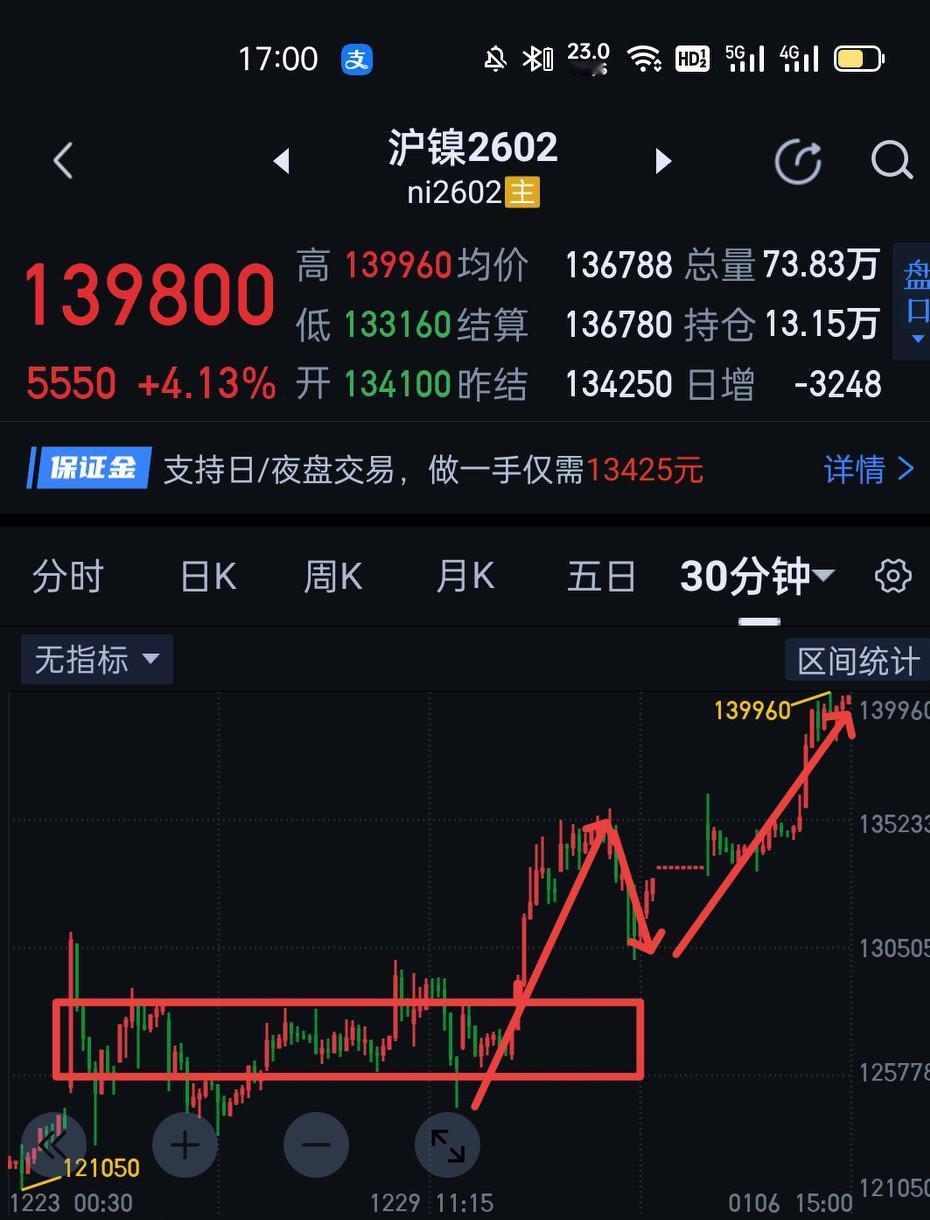 沪镍商品期货,夜盘138100如不被有效破坏,仍不适合做空单。可观察是否围绕139960~138100构建1分钟中枢,如果是1分钟中枢构建,后面要观察离开段是否背驰。不背驰,多单继续跟,直至出现新的背驰结构导致三十分钟一笔上完成。背驰,则要预防三十分钟一笔上完成。目前简单用三十分钟图去观察仍未呈现卖出结构。