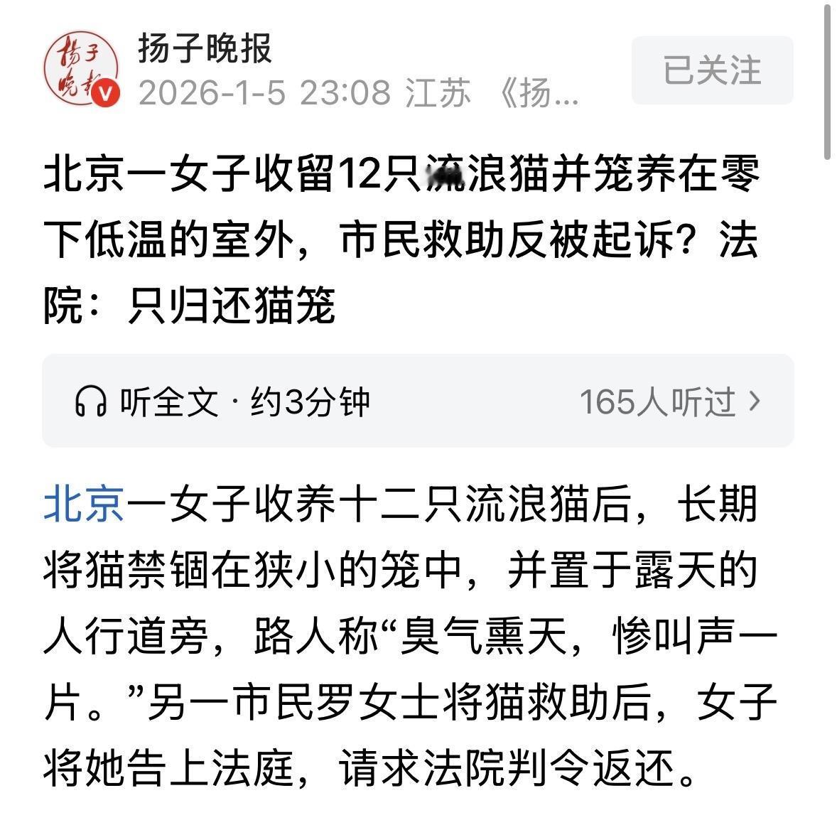 北京,一大妈收养了12只流浪猫,却不好好养,她长期把猫圈养在狭小的笼子中,并在零下的天气故意把猫养在室外,放任它们自生自灭,导致好多猫都被冻得病怏怏。一女子看不下去了,把猫连同笼子一起拉到了自己开的救助站,自费给猫看病吃药,让它们吃得饱住得暖,救了猫咪们的命。谁料,大妈得知猫被拉走后大发雷霆,她一纸诉状告上法院,要求女子把12只猫连带笼子全部还给她。法院判决太解气! 2025年1月17号这天,冷风跟刀子似的。 有人路过一小区大门,被眼前的一幕给气的不行。 就在人行道边上,杵着个一人多高的木箱子,大冬天零下好几度,这笼子就这么露天放着,也没个挡风遮雨的地方。 网友凑近仔细一瞅,笼子里密密麻麻塞了12只猫,一个个冷得缩成一团,惨叫声一片。有的明显病恹恹的,眼看就要不行了。 这可把路人心疼坏了,赶紧拍照发网上,呼吁大家关注。 这帖子一出,住在附近的毛先生坐不住了。他也是个爱猫的人,看着这些猫这么惨,立马开车赶了过去。 到了现场一看,实际比网上说的还糟心。毛先生把笼门打开,一股臭味直冲脑门。 十几只猫挤在狭小的空间里,连个转身的地儿都没有。 毛先生特别生气,这哪是养猫啊?这是造孽啊! 就在这时候,另一位罗女士也闻讯赶来了。她自己经营着一家救助站,看这场景眼泪都在眼眶里打转。 她当场就跟毛先生说,这猫再在这儿待下去全都活不了,我那儿有地方,有暖气,我能送去治! 大家一合计,为了救命要紧,赶紧七手八脚把猫装车,连同那俩破笼子一起拉到了救助站。 罗女士自掏腰包给病猫看病、喂药,总算是把这些小命从鬼门关拉了回来。 本来这事到这儿,也有了个暖心的结果。可谁成想,这猫的主人,也就是64岁的柴大妈得知后不干了。 据说,这12只猫都是她从街头捡回来的流浪儿,后来一起圈笼子里养在了室外。 她一看罗女士竟然未经允许就把她的猫端了窝,一纸诉状把罗女士告上了法庭。 在柴大妈心里,这就是她的私有财产,罗女士这就是明抢。她要求法院判罗女士把12只猫还回来,连同那两个笼子,要是猫少了一只,就得赔钱。 然而,罗女士却觉得柴大妈简直就是伪善。她表面上充当好人收养猫,却不好好养,让猫吃不好住不暖,这就是变相虐待! 罗女士觉得自己出手相助,没有任何问题。 到了法庭上,这事儿就变得有点荒诞了。 柴大妈为了证明猫是她的,拿出了一本宠物健康防疫证。 结果罗女士当场表示,你这证上写的猫品种跟这12只压根对不上号啊!再说了,你既然是主人,那你说说,这12只猫分别几岁了?哪只绝育了?哪只生过病? 这一问把柴大妈问懵了。她支支吾吾,只说是自己收养的,但具体到每只猫的情况,那是一问三不知,记不清年龄。 一审的时候,法官表示,柴大妈虽然捡了猫,但没办正规手续,这所有权本来就模糊。 更关键的是,柴大妈把猫扔在大冬天的室外楼道里,吃不饱穿不暖,还得病,这叫哪门子收养?明显违反了动物保护的公序良俗。 反观罗女士,人家把猫带走,不是为了吃肉也不是为了卖钱,纯粹是看猫快死了,为了救命,为了大家看着不忍心。 这叫紧急救助,是在做好事,根本不是非法侵占别人财产。 所以一审法院判决罗女士把那两个空笼子还给柴大妈,但猫不能还。为什么?因为还回去就是让它们继续遭罪,甚至等死。 法院不能支持这种虐待动物的行为。 柴大妈一听不乐意了,觉得自己丢了面子又折了财产,上诉到第二中级法院。 《民法典》第8条规定:民事主体从事民事活动,不得违反法律,不得违背公序良俗。 传统观念中,柴女士作为捡拾人和饲养人,似乎天然拥有对这12只猫的所有权,理应享有占有、使用、收益和处分的权利。 然而,民事权利的行使是有底线的,那就是不得违背社会公共秩序和善良风俗。 柴女士将猫关在狭小笼内,置于零下低温的室外人行道,导致猫咪生病甚至病危。这种行为在社会普遍认知中属于“虐待”,而非合法的饲养。 《民法典》第10条规定:处理民事纠纷,应当依照法律;法律没有规定的,可以适用习惯,但是不得违背公序良俗。 柴女士拿不出合法收养证,其所有权本身就存疑。而罗女士的救助行为虽然在形式上“拿走”了他人财物,但在实质上符合社会正义。 罗女士的行为虽然在形式上侵犯了柴女士的占有,但在价值位阶上,救助生命的公序良俗高于虐待式占有的私人权利。 2025年12月22日,二审结果下来了,维持原判。 二审法官的意思更明确:一审认定事实清楚,适用法律正确。 罗女士的行为是为了维护公共利益和生命安全,没毛病。柴大妈如果真爱猫,就不会让它们在零下温度的户外自生自灭。 罗女士如今也算是松了一口气,她说只要猫能活下来,这官司打赢了,我心里也踏实。 而那12只猫,如今在救助站里吃得饱睡得暖,病也治好了大半,总算是脱离了苦海。 对此,你怎么看? 关注@运良说法 学法律知识不迷路