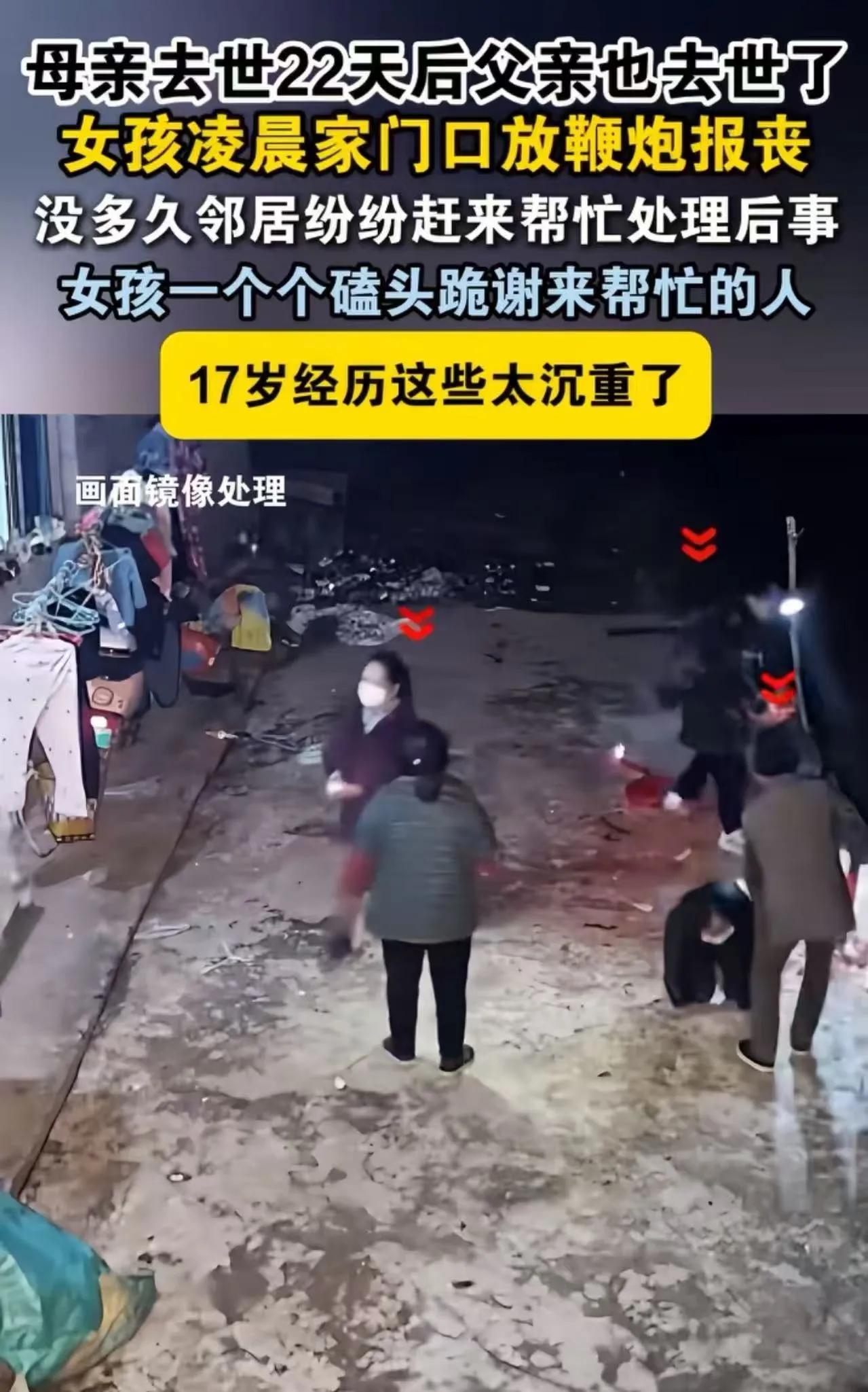 太令人心痛了!母亲去世才22天,父亲也去世了,17岁女孩凌晨在家门口放鞭炮报丧,没多久邻居纷纷赶来帮忙处理后事,女孩一个动作,令人泪目!网友:17岁经历这些太沉重了! 这真是令人心碎的故事。17岁的女孩在失去父母后,独自面对如此沉重的打击,凌晨在家门口放鞭炮报丧,表达内心的悲痛和哀思。邻居们纷纷赶来帮忙处理后事,她的一个动作令人动容,展现出坚强与无助交织的情感。网友们纷纷感叹:如此年轻的生命,承受了太多的痛苦,令人心碎。愿她在未来找到力量,逐渐走出阴影,愿逝去的亲人安息。父母亲人离世 父母亲人离世 5岁孩子离世