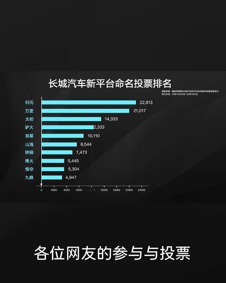 长城汽车全新平台正式定名为“归元”,以2.2万投票数高居榜首,我的理解,名字翻译过来就是不忘初心,不搞花里胡哨,既是回归本心,又是所有都汇聚在一起,各种动力都能承载,混动、汽油、柴油、纯电、氢能,什么场景都能适配。 之前风云电视剧出来的时候,有个大招就叫三分归元气,后来网友加了个后缀七分靠打拼,放在这莫名合适,技术是集大成者,又是长城挑战自我的成果。 投票过程还有个好玩的插曲,驴火这名儿投票数也很高,魏总说要是驴火第一就用驴火,不玩虚的,用户说啥就是啥,太有亲和力了!【来自懂车帝车友圈】