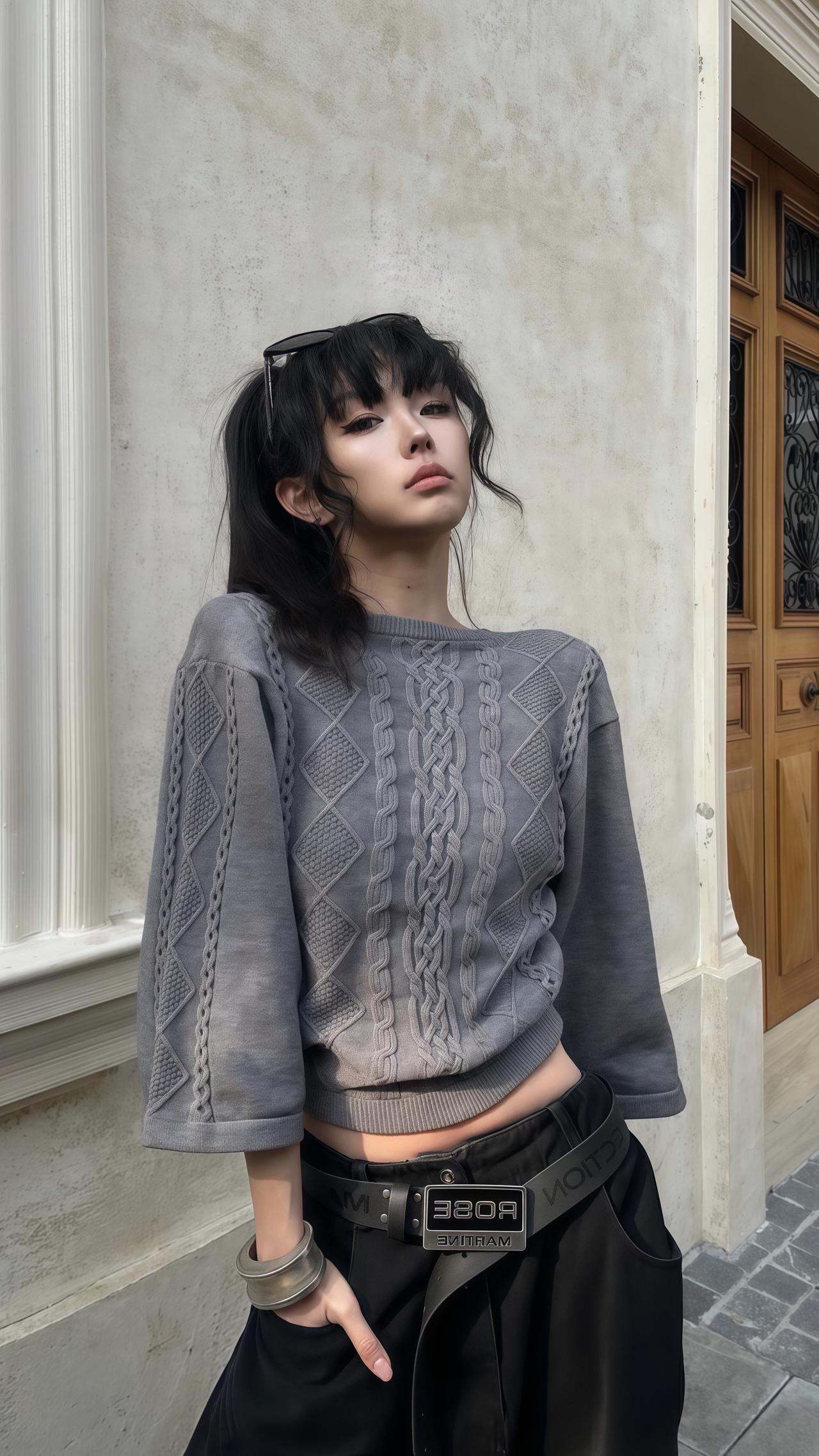 米色高领上衣搭配破洞微喇牛仔裤,白色运动鞋舒适自在,黑色链条包精致点缀,随性又时