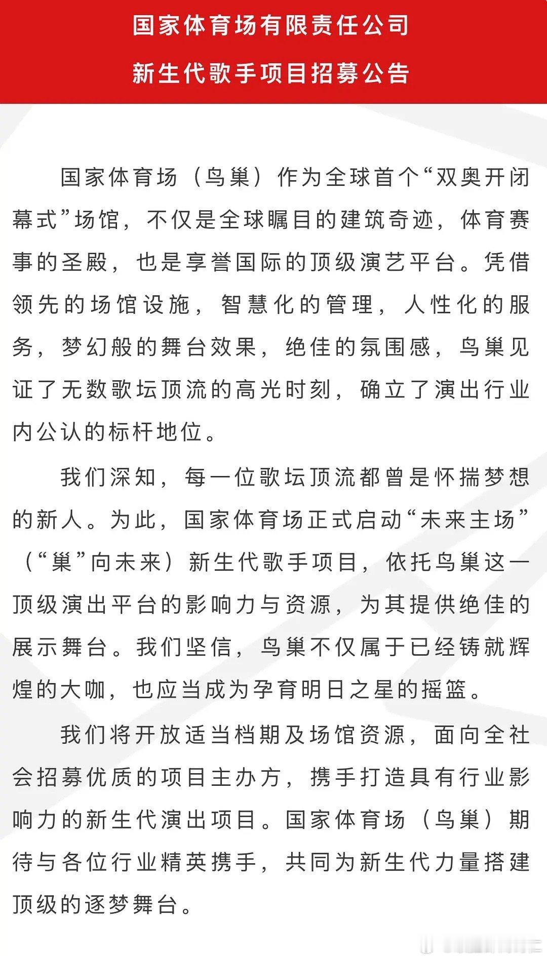 鸟巢刚刚发了招募新生代歌手公告