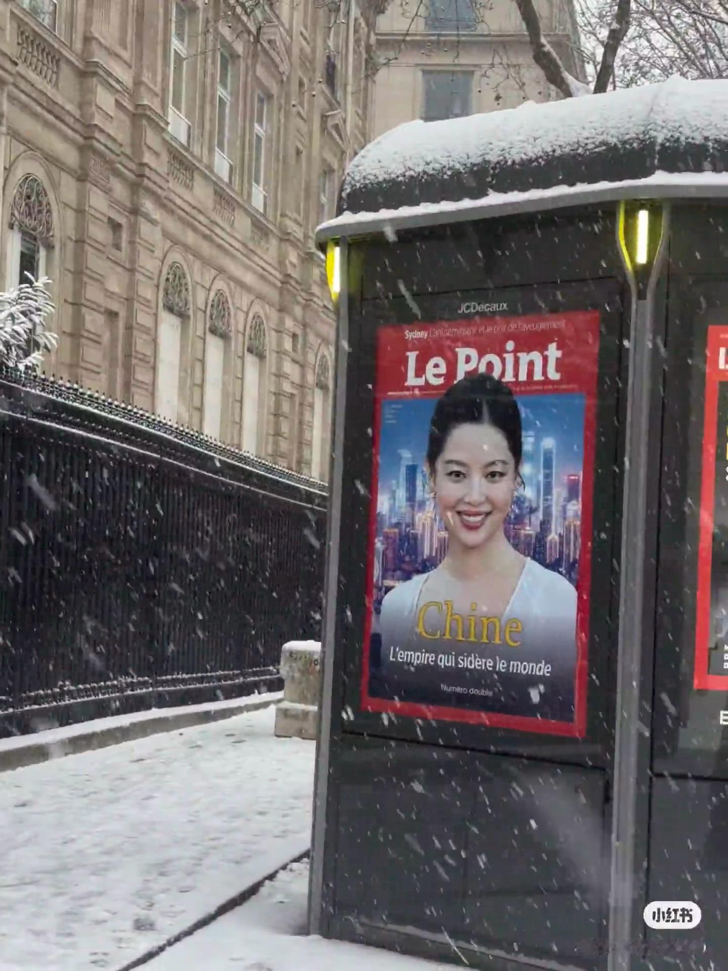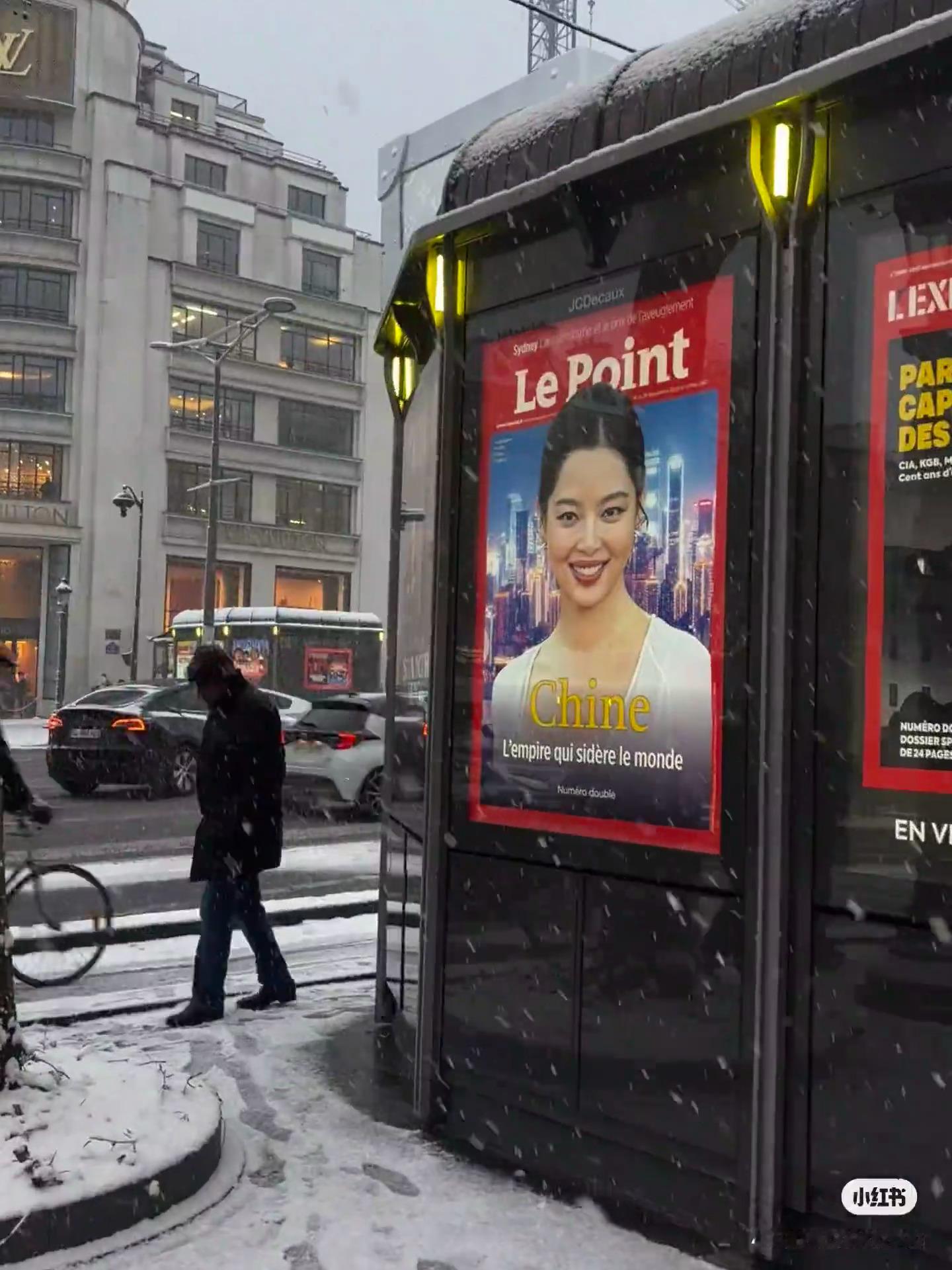 巴黎的雪落满街头,恰好落在辛芷蕾的《LePoint》封面海报上。红底海报衬着城