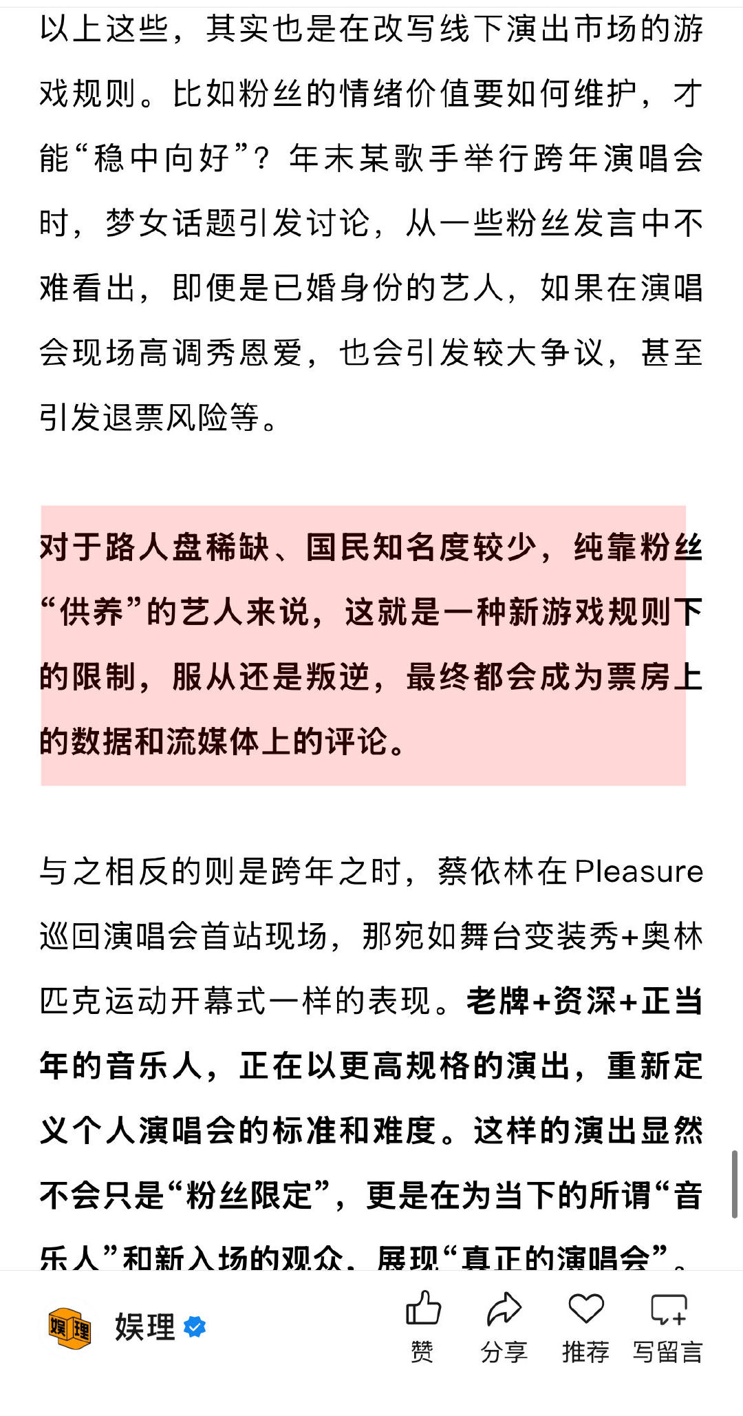 业内谈个人演唱会越来越多的原因 业内说跨界流量音乐节秀费超百万 从电影及长剧开机率下降的角度,影视剧圈也是趋于饱和的状态,不需要那么多艺人,也没有更好的剧本。对于一些跨界艺人来说,能够参与更多的线下演出,也是高性价比的事情。 “上音乐节只需表演40分钟左右,就能挣到一笔百万级收入,何乐而不为呢?另外一个就是去库存、增加商业变现的渠道,像一些很多年都没有出来的艺人,这两年居然也在开演唱会。说明线下演出市场比以前好,他们愿意通过这样的方式来获得更多收入。”娱理独家↓