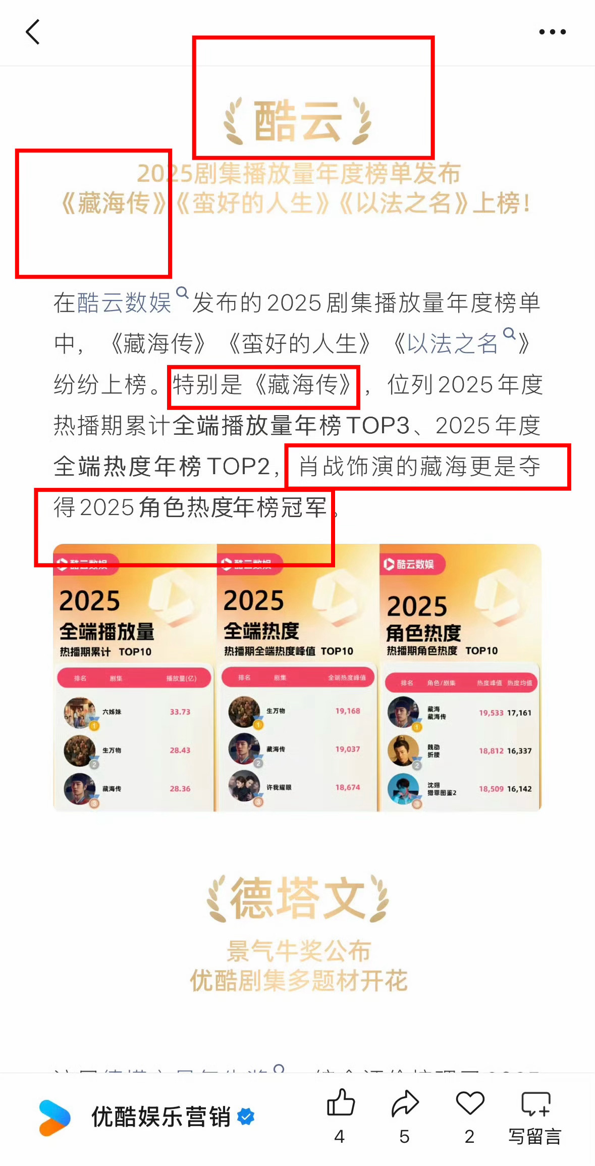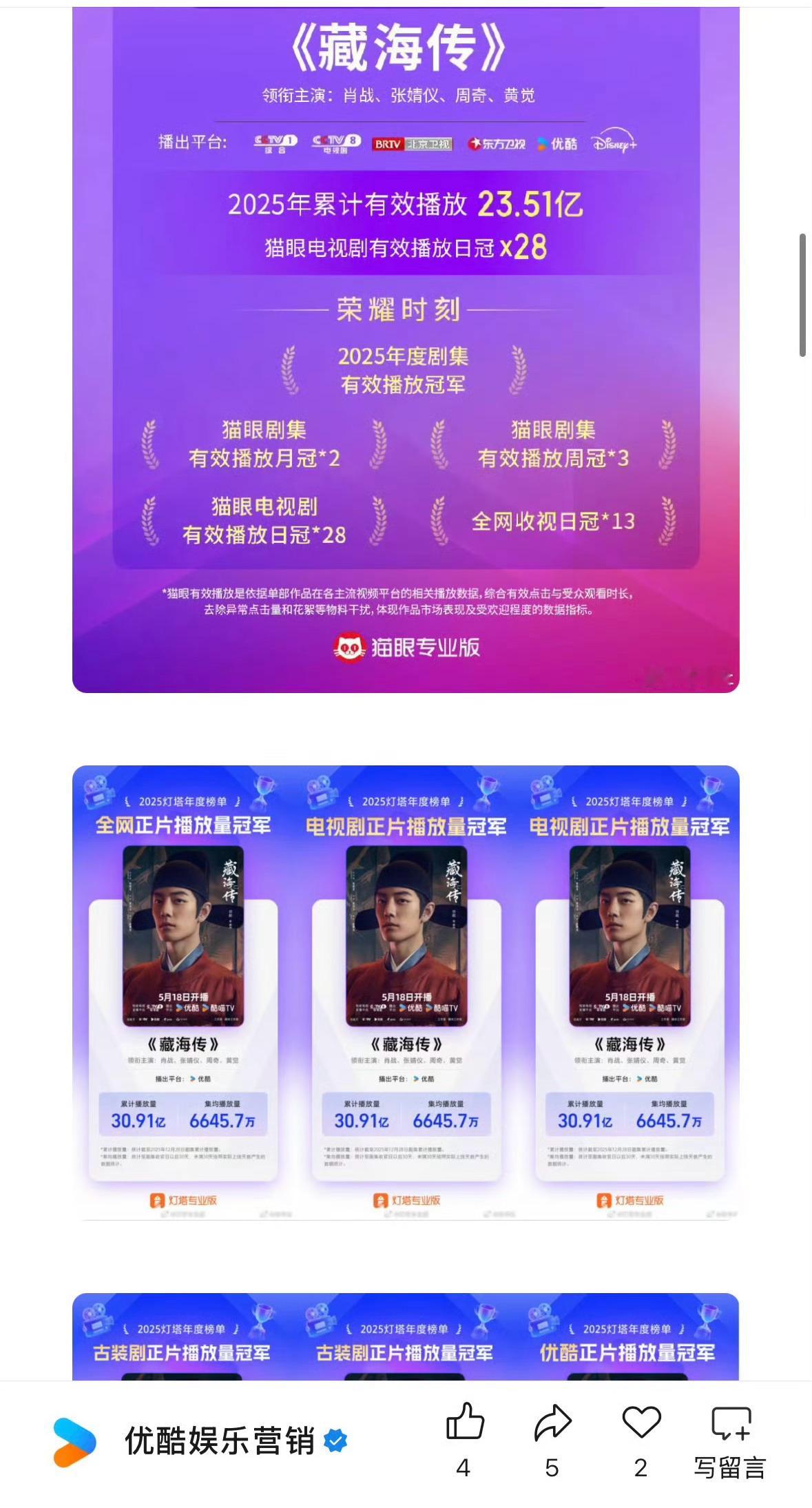 优酷在发2025成绩单!完全就是 我们有藏海传!还把新华社总结的31个冠军重点强调了!好得意吧!! 肖战藏海断层第一