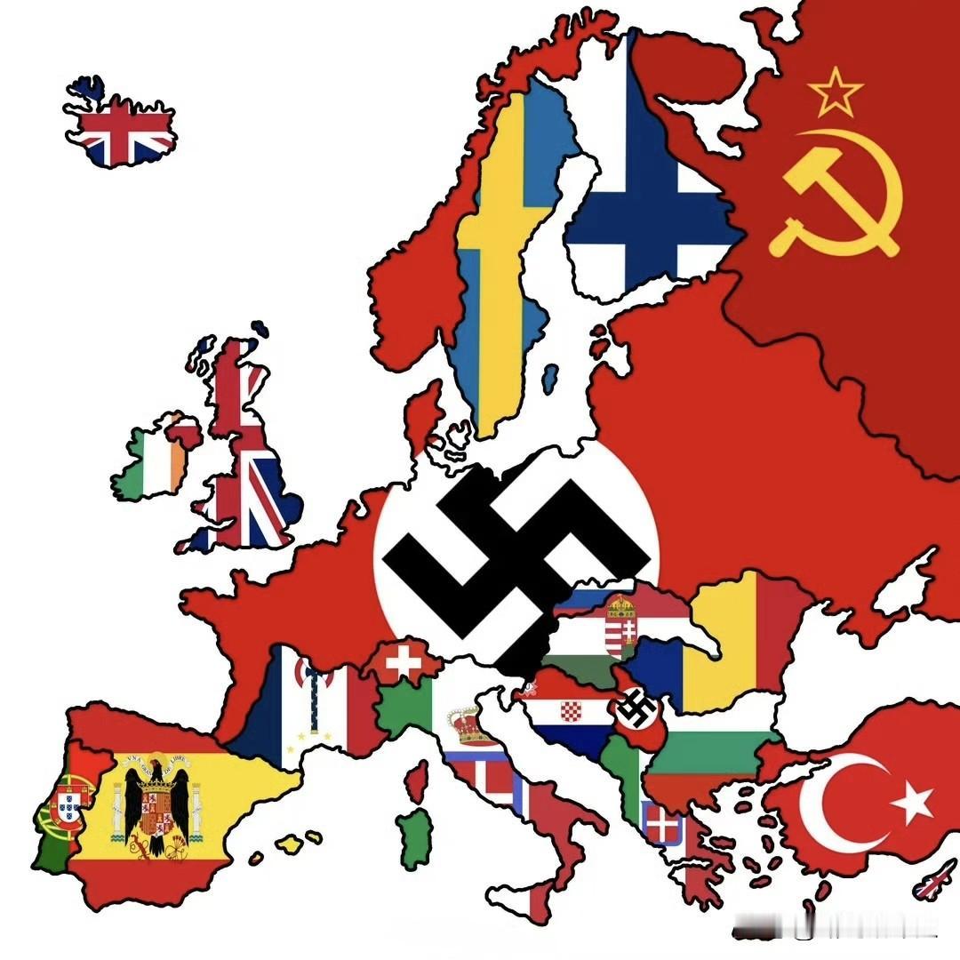 二战欧洲国旗地图,可以直观的看出德国、意大利的势力范围。匈牙利、罗马尼亚和保加利亚是德国的盟友,为德国提供了兵力和资源支持。维希法国、斯洛伐克和克罗地亚独立国是德国扶持的傀儡政权。 历史 二战 欧洲 德国 意大利