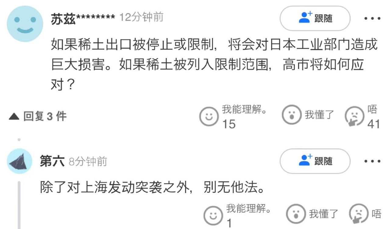 日本网友对禁止两用物资出口日本的事进行了讨论。一个网友给出了的解决方案是“除了对上海发动奇袭之外,别无他法。” 不过,看他的头像,应该是一个国内的串子,在拱火呢。他头像是成六代,一眼就是想独吞蜗蜗头。 长宁区串子笑谈咩了小倭,以后的日料就不叫日料了,就叫新沪菜。 毕竟车力巨人新年的讲话重点提到今年是昭和100年。既然是100年,那就是百年之后。