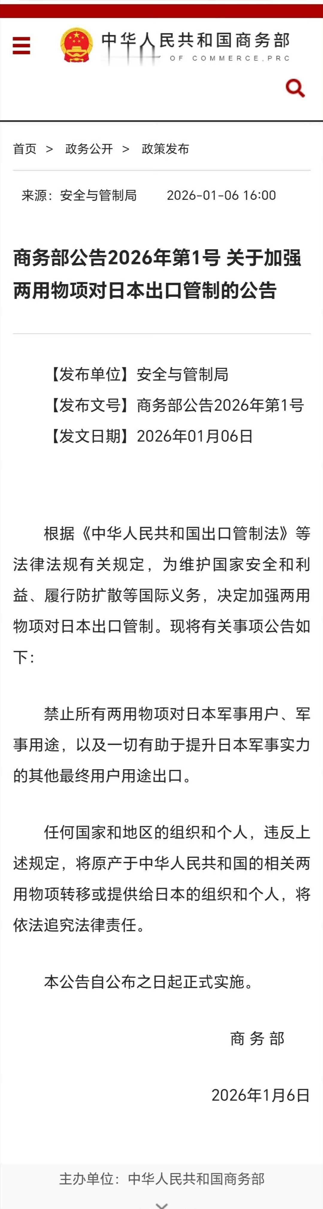 中国禁止所有两用物项对日本军事用户、军事用途,以及一切有助于提升日本军事实力的其他最终用户用途出口。 后面这一句话“以及一切有助于提升日本军事实力的其他最终用户用途出口”很有威力,意思是上不封顶啊。什么大米、蔬菜也不给他出口了。白糖和棉花还是军民两用物资呢。 商务部官方网站上,一共列举了1030种两用物资,清单就有100来页。 比对美国更狠,这才是核蛋级别的制裁。之前美国还有跪的机会,这小日子连跪的机会都没有了。一旦认定它是一个对手,一定会给它一套它听得懂的语言。 日媒快速报道,小本子的很多评论还在一如既往的在赢。只有个别人看懂了。