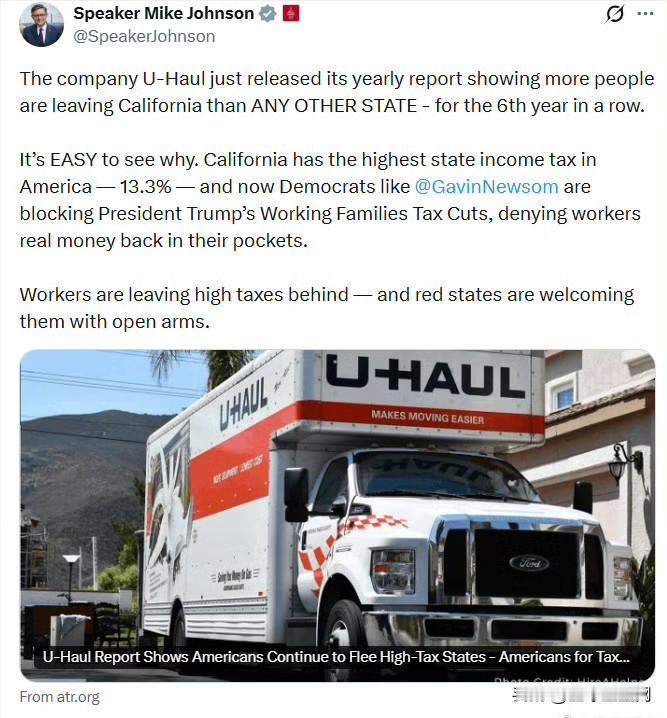议长约翰逊: U-Haul 公司刚刚发布了年度报告,显示离开加利福尼亚州的人数连续第6年位居全美各州之首,超过任何其他州。 原因一目了然。加州拥有全美最高的州所得税率——13.3%。而现在,像加文·纽森这样的民左党人,正在阻挠特朗普总统的“工薪家庭减税”政策,让劳动者拿不到本该装进自己口袋的真金白银。 工人们正在逃离高税负,而红州正张开双臂欢迎他们的到来。