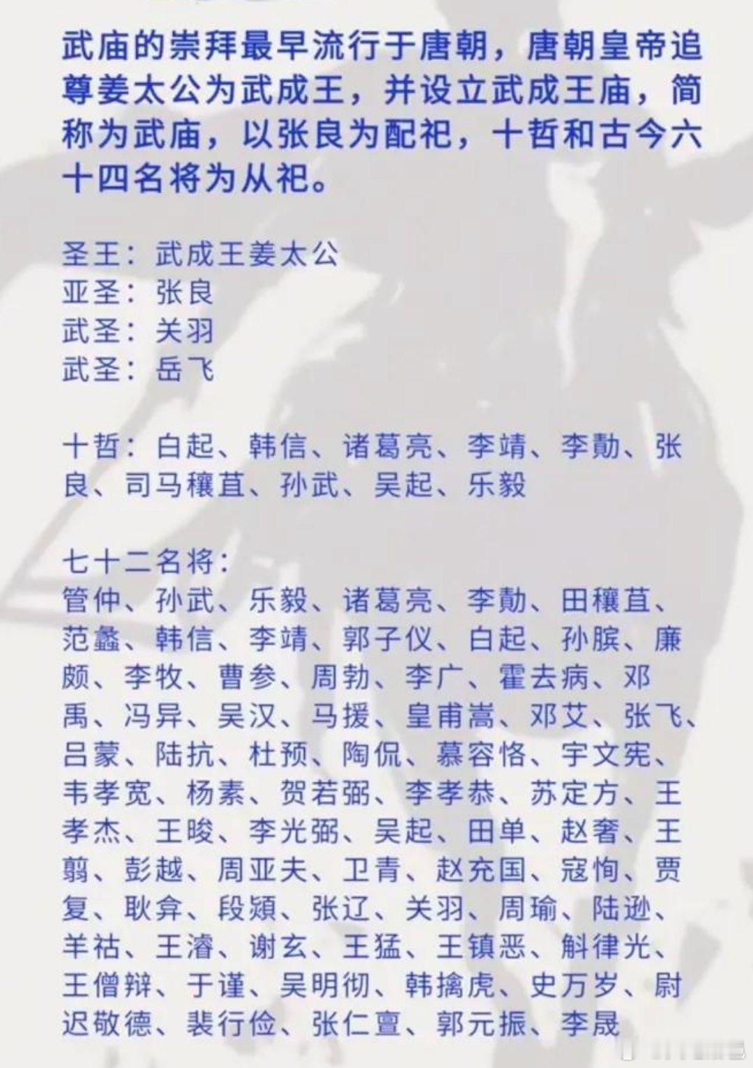 古代武庙有哪些名将?圣王,武成王姜子牙。唐玄宗追尊。明太祖废止,将姜子牙移入帝王庙从祀。亚圣,张良。明太祖废止。武圣,关羽,明朝万历帝封为“协天大帝”,民间开始建关庙,民众视其为“武圣”化身。武圣,岳飞。明万历帝封岳飞为“三界靖魔大帝”,民间开始建岳王庙,民众视其为“武圣”化身。清代,因为岳飞是抗金名将,皇帝不再推崇,独尊关羽为武圣,关庙开始遍及全国。民国时期,改为关岳庙合祀关羽、岳飞,并设二十四名将分祀。不过,现在关岳庙数量远少于关庙。越南,阮朝仿唐制建武庙,保留姜子牙主祭,并增祀该国六位名将。