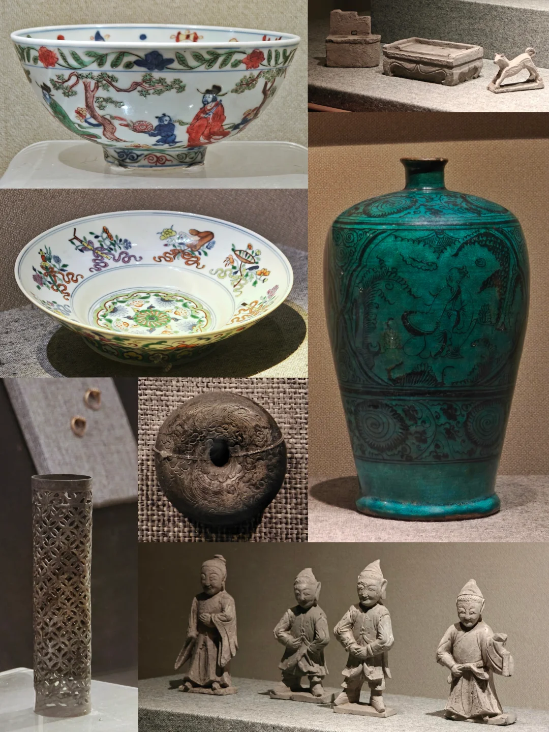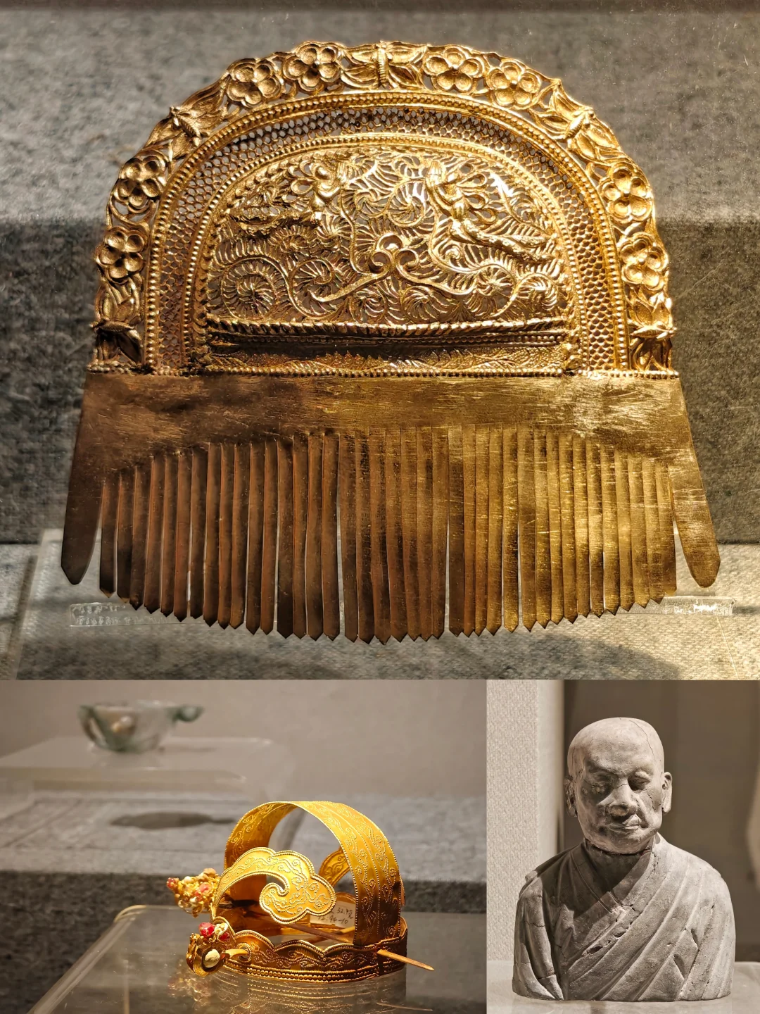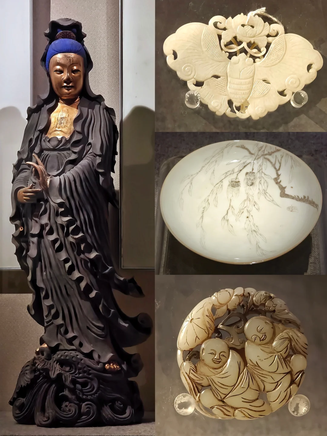 🔸另有明仙人乘槎犀角杯,清郑燮《兰竹石图》轴清《古逸丛书》雕版,西汉铜阳燧,西汉男女灰陶俑,妾莫书出土鸡心形玉佩和嵌玉鎏金铜带板,明双层透雕云龙纹玉带板,元宣慰使司都元帅府夜行铜牌,明石刻《铸镜图》,清金冠+嵌珠宝龙+凤金簪等