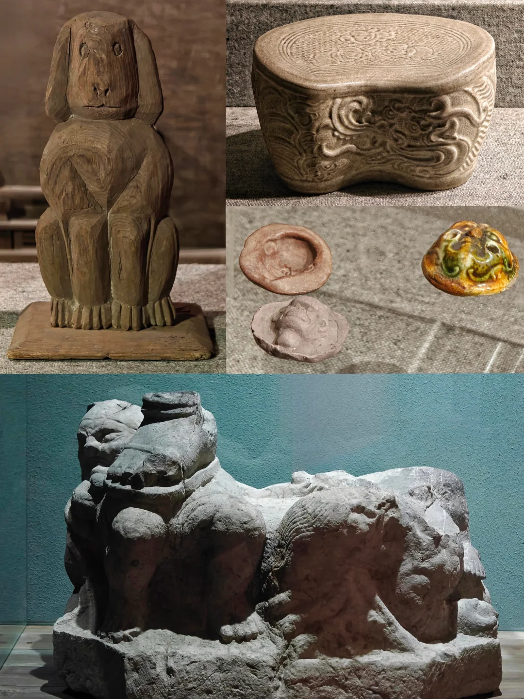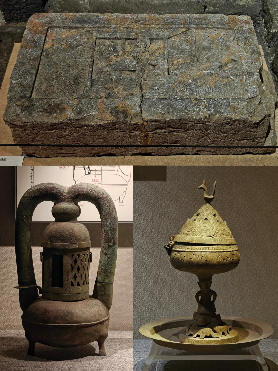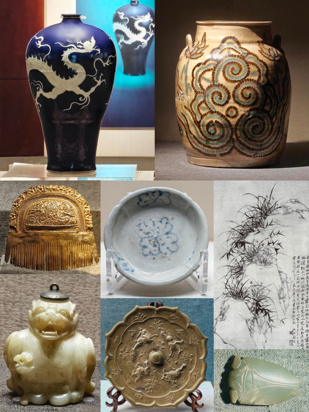 🔸另有明仙人乘槎犀角杯,清郑燮《兰竹石图》轴清《古逸丛书》雕版,西汉铜阳燧,西汉男女灰陶俑,妾莫书出土鸡心形玉佩和嵌玉鎏金铜带板,明双层透雕云龙纹玉带板,元宣慰使司都元帅府夜行铜牌,明石刻《铸镜图》,清金冠+嵌珠宝龙+凤金簪等