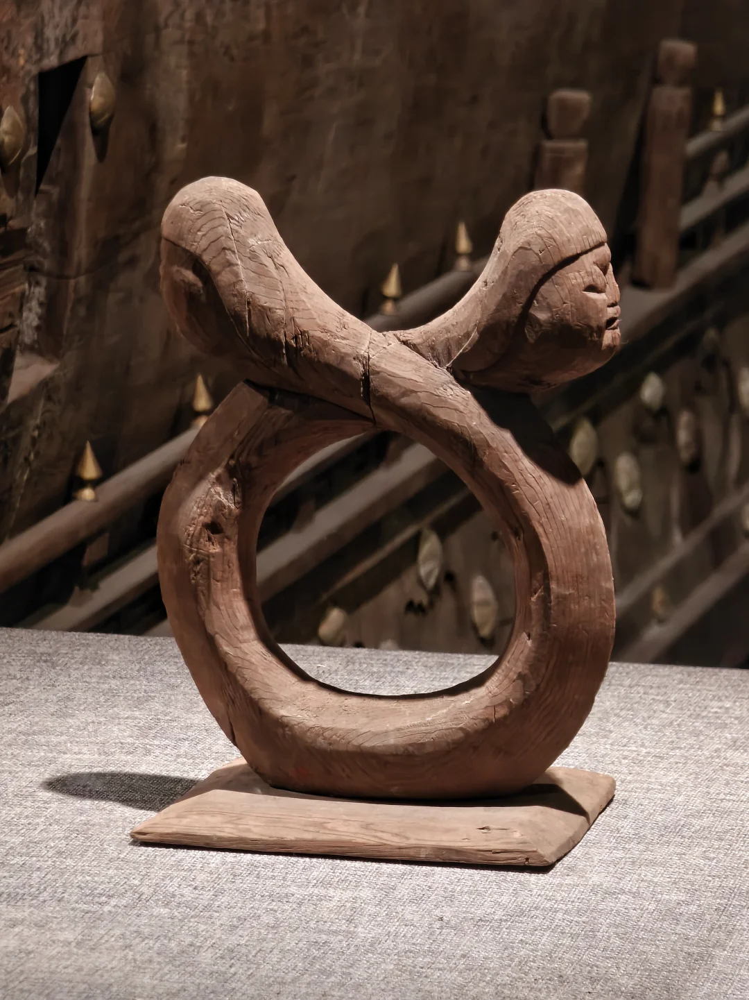 大厅雕塑原型,寻阳公主墓出土。桫木制,造型独特,呈现两颈相交伏羲和女娲形象,下部蛇身合为一体圈成立体状(另有风格相同的人龙、人鱼、人蛇木雕独体神怪俑)