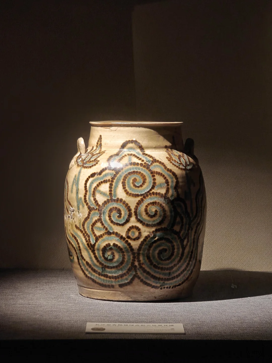 长沙窑罕见珍品。罐身上由褐、绿两色圆点排列组成的联珠纹与波斯萨珊王朝的联珠纹相似。双系印有“王”的字样。扬州在唐朝是全国蕞大陶瓷集散地之一,故出土全国各地窑口瓷器,见证古丝绸之路繁荣