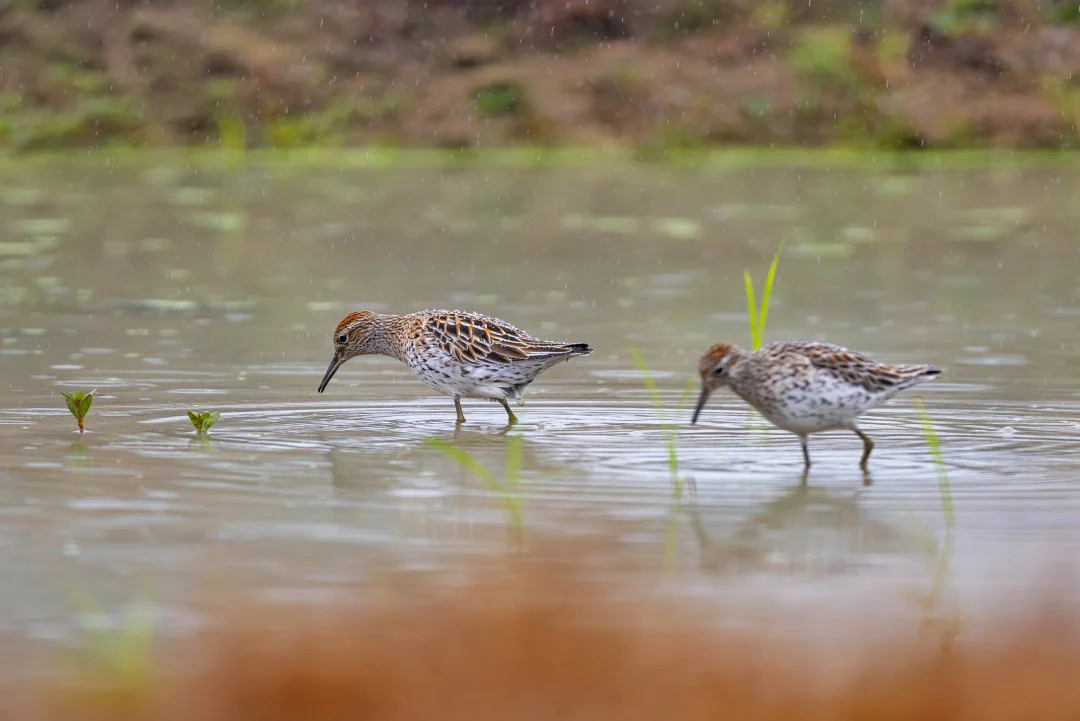 下雨天仍然辛苦干饭的一对尖尾滨鹬