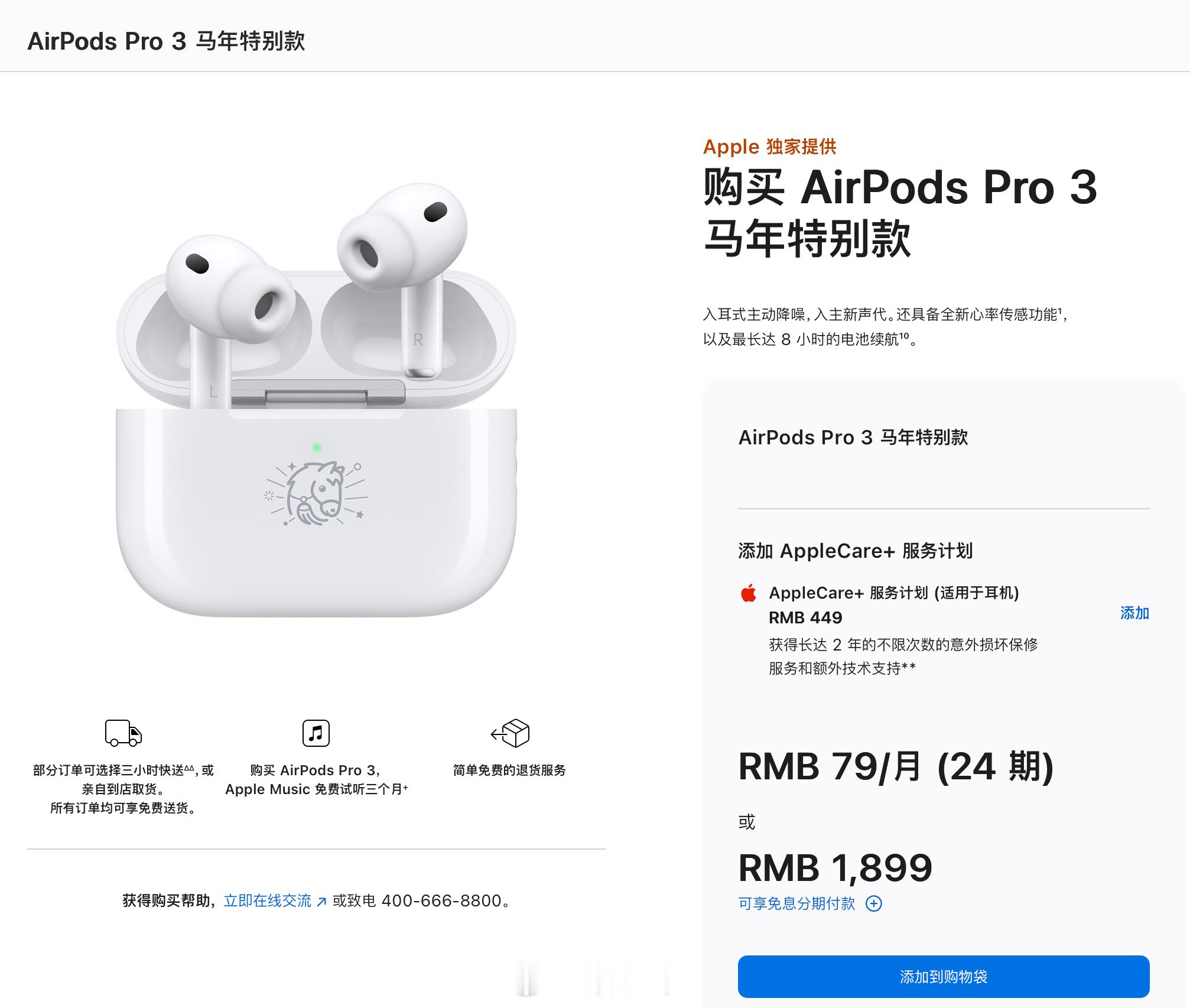 AirPodsPro3马年特别款上架苹果发布AirPods 3马年特别款,和普通版对比,就是盒子上印了个马,官方价格还是1899元