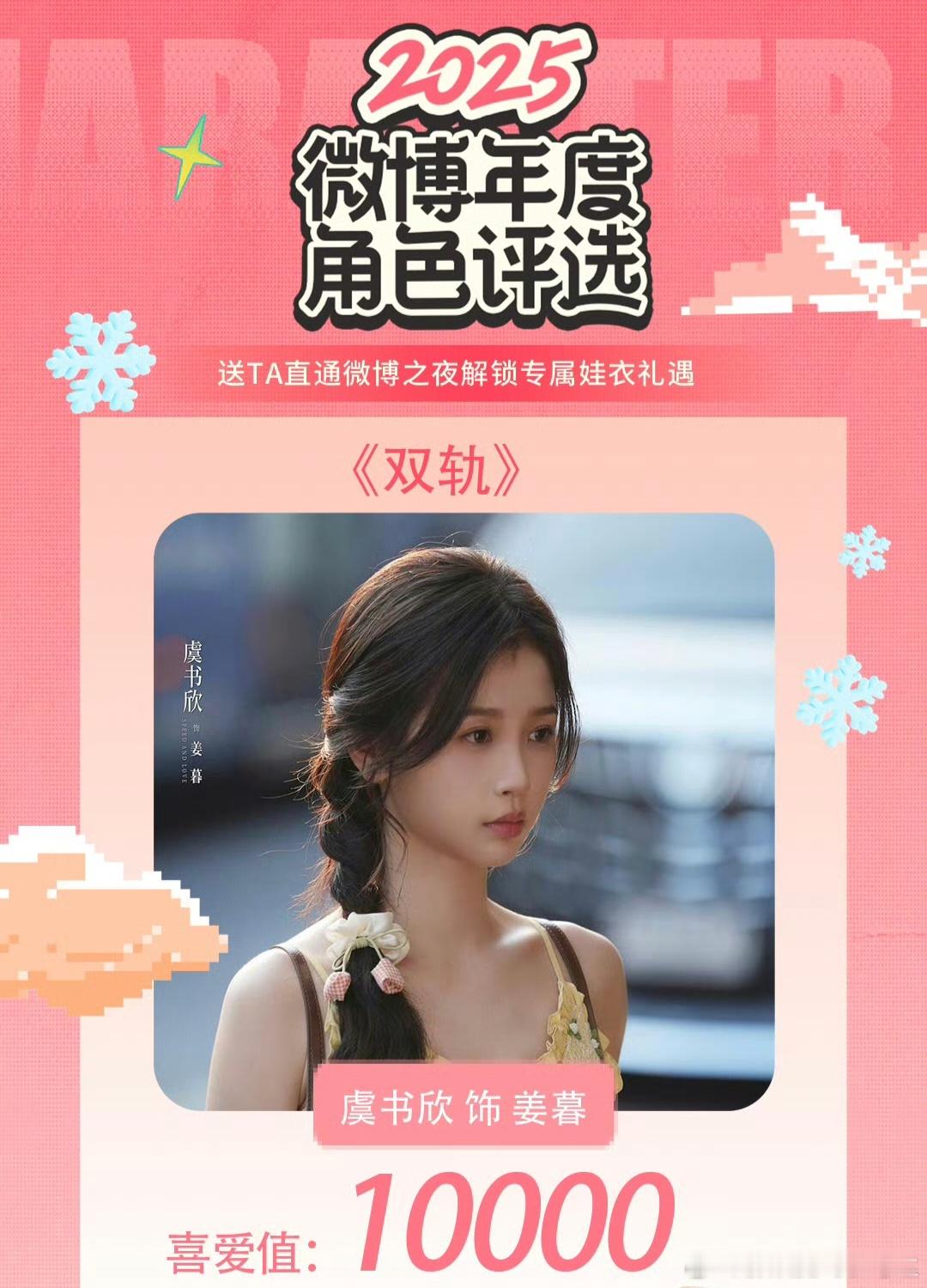 虞书欣首个双角色破万艺人虞书欣两部剧两个主演角色在微博年度角色评选中喜爱值破万!一部是《嘘,国王在冬眠》里的卫枝,一部是《双轨》里的姜暮
