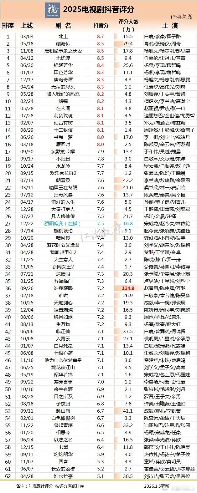 截止到1月5日的2025年开播的剧集dy评分和评分人数,这也是证明一部剧爆没爆的比较重要的数据之一