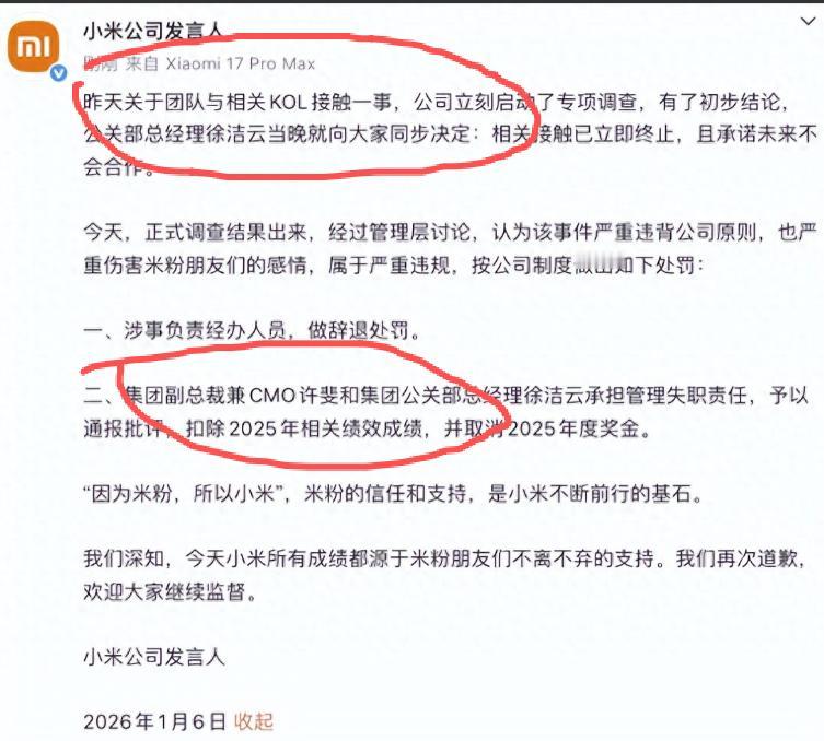 就在刚刚,小米就“接触KOL”相关争议发布处罚声明,但最关键的未知是,具体接触链条是谁牵头、触及哪些平台与账号、有没有形成付费合作或灰色投放,目前外界只看到“处罚结果”,还在等细节落地 因为“KOL接触”在今天的舆论场太敏感,所以这份声明本质上是在解释两件事,第一,是否存在违规营销、诱导测评、利益输送,第二,内部管理有没有失控,我注意到企业这类处罚通报通常会写清“违反公司廉洁/合规规定”“影响品牌声誉”“已作出停职、解除、追责”等措辞,换句话说,小米是在用内部纪律把外部质疑先压住,同时给合作方、渠道方一个明确边界 接下来焦点会落在证据与流程,因为所以网友要的不是态度,是时间线,谁在什么日期联系了哪些KOL,用了什么话术,是否承诺资源位、样机、费用、差旅,金额是多少,是否走合同,是否走对公,有一说一,如果只是“员工私自联系”且无利益交换,舆情可能很快降温,如果牵涉多部门、多轮沟通,甚至与新品节点、评测口径绑定,那就会演变成对企业营销合规的系统性追问 最后看大格局,手机与智能硬件行业竞争极卷,投放、测评、口碑的边界越来越窄,小米这次“先罚后补细节”能不能止血,取决于后续是否公开更透明的合规机制和第三方核查结果,下一波讨论,很可能就盯着“还会不会有第二份通报”