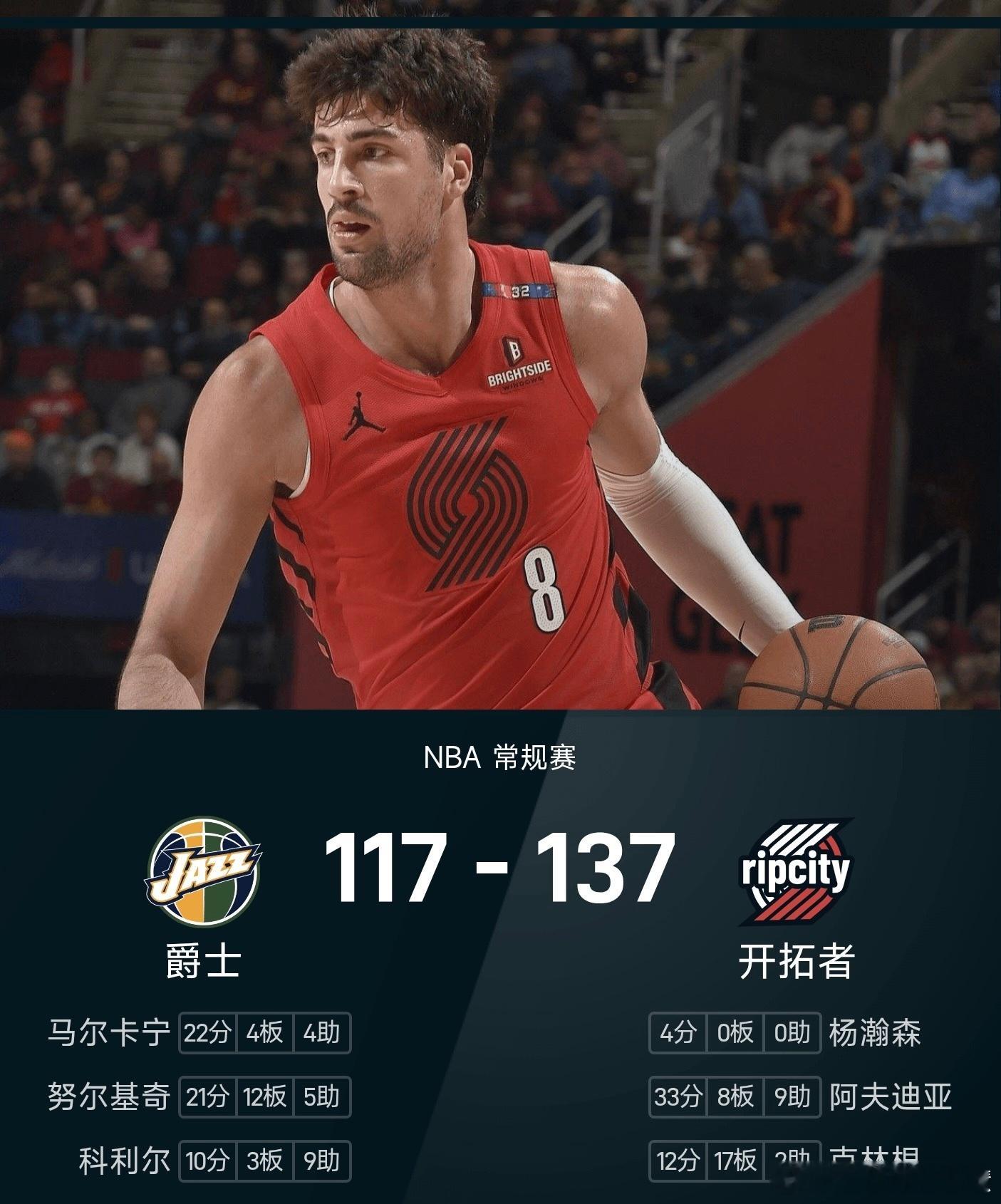 01月06日讯 25/26赛季NBA常规赛燃情开战,波特兰开拓者坐镇主场火力全开,以137-117的悬殊比分轻取犹他爵士,收获一场酣畅淋漓的胜利。开拓者大胜爵士此役阿夫迪亚状态火热,独揽全场最高的33分8篮板9助攻的准三双数据,攻防两端的统治级表现成为球队赢球的绝对核心。杨瀚森上来就得分,中国球员杨瀚森末节替补登场,虽出场时间有限,但仍高效贡献4分,在有限的舞台上展现了自身的潜力。