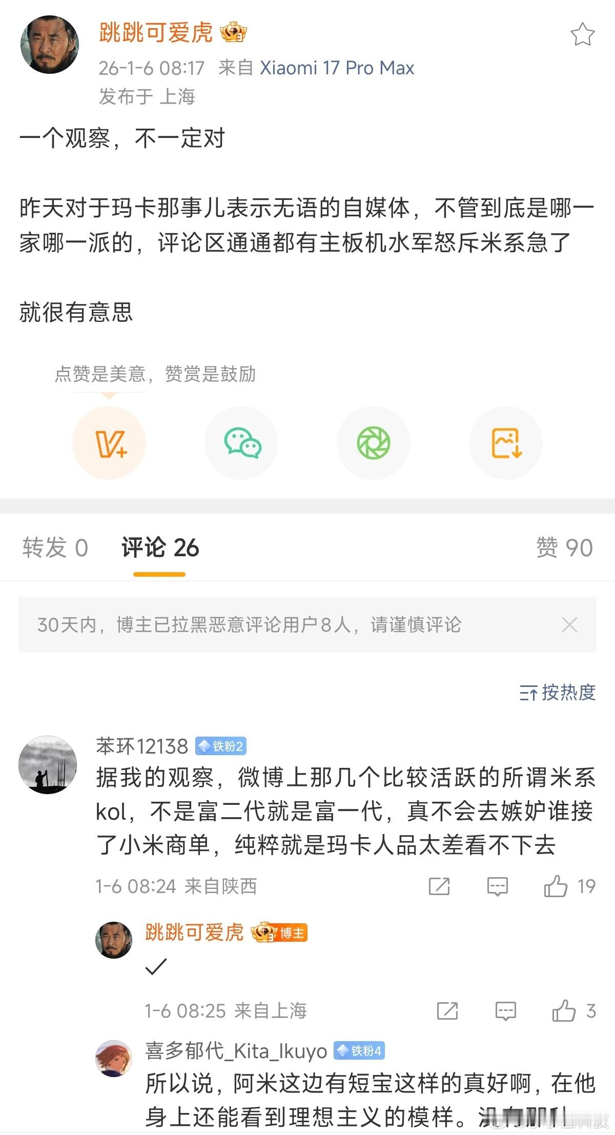 最后再说一下吧。这件事,该骂骂、该喷喷,事情已经闹大,也有了清晰的结果回应,大家也可以找一些信息碎片拼接一下,对整件事的过程大概能够了解个七七八八。为什么米粉的反应会如此之大?真的是米粉、kml嫉妒?事实上,阴阳怪气小米的博主有很多,像大家现在非常喜欢的董老厮,他当年的一声:军儿,让很多米粉不喜欢,现在呢? 有些人阴阳小米是因为他不了解,跟风向走,在解除误会后可以接受。有些人阴阳小米,是他明知道这件事的真实原因,还在坚持不懈、不分青红皂白的去抹黑小米。从1月3日雷总直播拆车、后半段挨个辟谣,说明了小米在公关上做了很大的工作,改变很大,昨晚的辟谣声明就是一个很好的例子。在改变策略的初期,有工作漏洞可以理解,能够快速解决问题,也可以理解,吃了昨天的亏之后,要把漏洞补齐。为什么米粉唯独对那么不能容忍???看看他们这几个人的发言就知道,根本不是阴阳,而是实实在在的抛开事实去阴阳小米,甚至发言内容有违做人的基本准则。图中网友说的很多,不嫉妒谁接商单,纯粹是看不惯某群人的人品。
