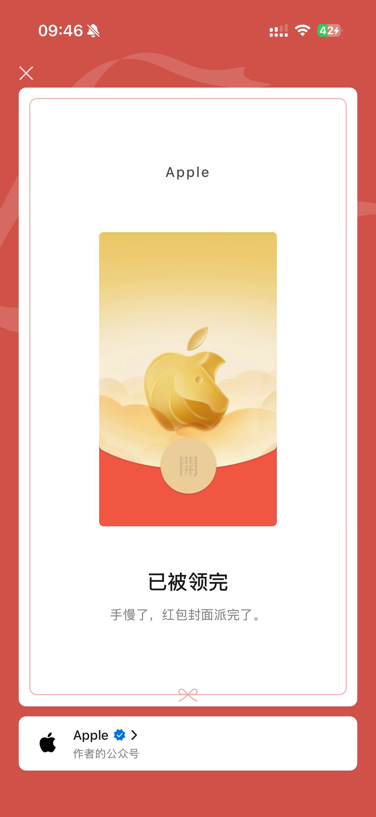 Apple 公众号今天上午发了马年微信红包封面,有抢到的朋友吗?等我看到的时候就已经被领完了苹果马年微信红包封面来了