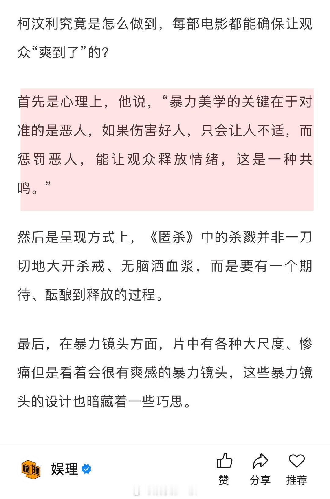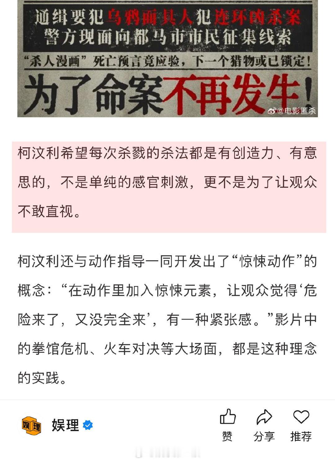 匿杀导演回应如何能让观众爽到 柯汶利希望每次的杀法都有创造力 导演柯汶利回应为何每部电影都能确保让观众“爽到了”:首先是心理上,他说,“暴力美学的关键在于对准的是恶人,如果伤害好人,只会让人不适,而惩罚恶人,能让观众释放情绪,这是一种共鸣。”其次是呈现方式和暴力镜头的设计。他希望每次杀戮的杀法都是有创造力、有意思的,不是单纯的感官刺激,更不是为了让观众不敢直视。娱理独家↓