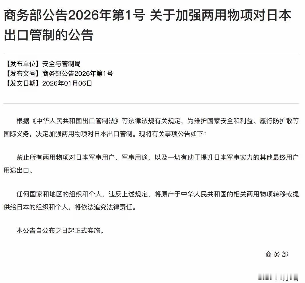 日本每挑衅一次,中国的反制便收紧一分! 2026年初,中国打响反制日本的第一枪!由于高市早苗涉台发表错误言论且拒不悔改,商务部发布1号公告,禁止所有两用物项向日本军事用户、用于军事用途,以及一切有助于提升日本军事实力的其他最终用户用途出口。 关键词“全面禁运所有两用物项出口”,还严禁他国协助日本绕开禁令,可见此次中国反制力度极大,对日本影响深远。 在韩国总统访华期间,中国做出这一决定,想必是中韩合作已达成共识。日本此前对中国实施制裁,如今中韩加强合作,日本只能靠边站了!所以说,日本若不承认错误,对历史罪行拒不悔改,就别怪中韩加强合作不客气。日本代表团无法来华,应深刻反省,纯属自作自受。 由此可见,中国此次果断出手,既是对日本挑衅的有力回击,也是对其扩军备战的致命打击!中国的红线不容侵犯,此次反制有理、有力、有节!