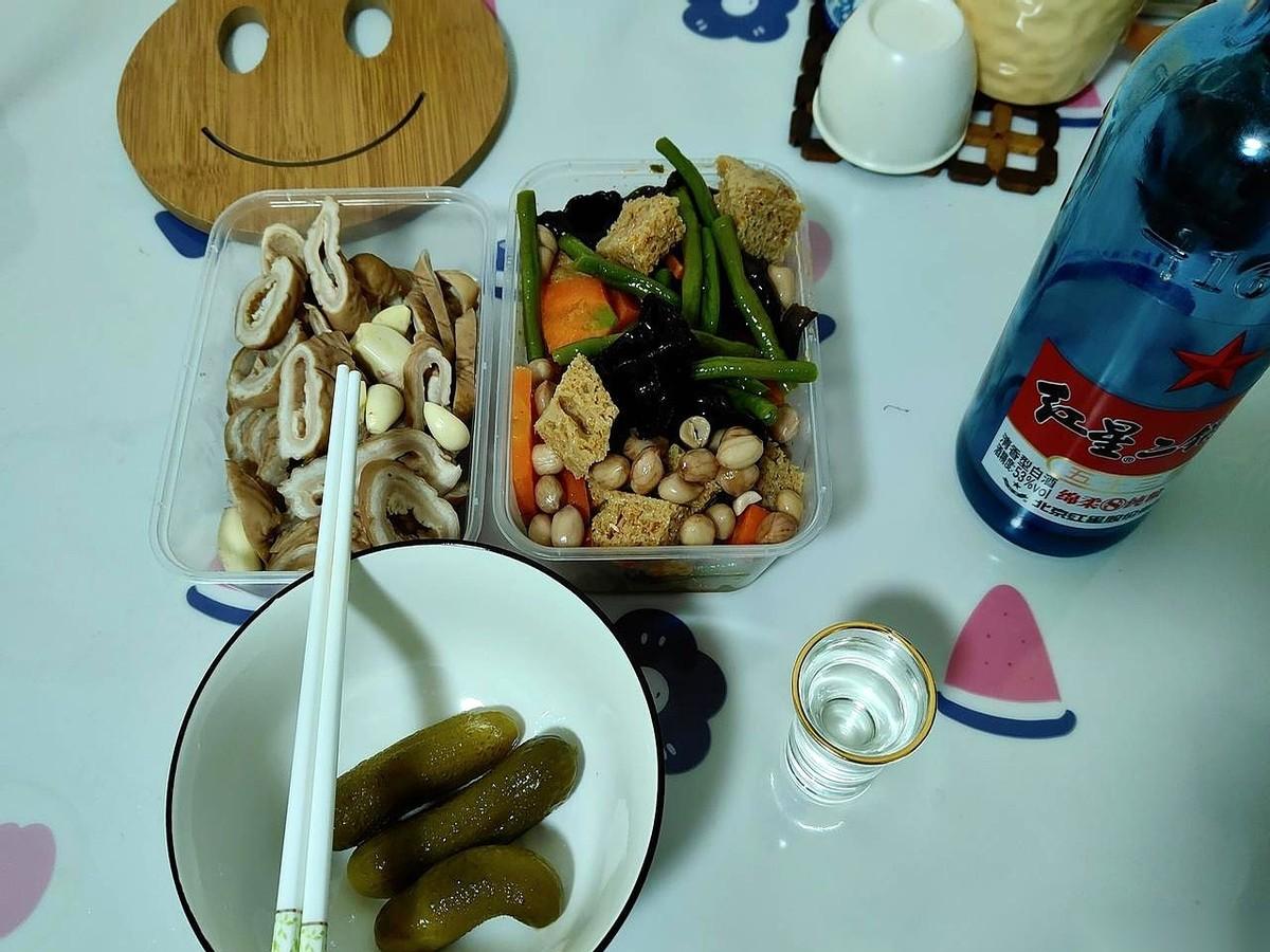 钥匙往玄关柜上一扔,人陷进沙发,连灯都懒得全开。胃里空得发慌,但脑子已经不想再转了,半点开火的心思都没有。 摸出手机,熟食店老板的微信还在置顶。 “老样子?” “老样子。” 塑料袋拎回来,没有一点汤汤水水。两只打包盒,一只白卤大肠,一只素什锦。我特意嘱咐过老板,什么汁儿都别给我浇,就干拌几瓣生蒜。 盘子都懒得拿,就着饭盒。先夹起一块大肠,肠壁刮得干干净净,没有半点腻歪的肥油。送进嘴里,牙齿轻轻一磕,外皮是卤过的韧,内里是清爽的脆,紧接着,那股子蒜瓣独有的辛辣猛地撞上来,直接把一天的疲惫顶了个跟头。 就得是这个味儿。 抄起桌上剩了小半瓶的红星二锅头,瓶盖一拧,给自己满上一杯。酒液顺着喉咙烧下去,像一条火线,瞬间点燃了四肢百骸。 再伸筷子去夹那份素菜,脆生生的豆角,滑溜溜的木耳,还有嚼起来嘎嘣响的花生米。清口,解腻,刚好给那一口酒、一口肠腾出回味的空间。 还不够。 又从冰箱里摸出一罐酸黄瓜,冰凉的玻璃瓶握在手里,激得人一精神。筷子头往里一探,夹出一根,酸甜的汁水顺着筷子滴下来。咬一口,那股子酸爽,直冲天灵盖。 窗外,路灯的光晕把夜色染成昏黄。屋里,就我一个人,一瓶酒,三样菜。 一口肉,一口酒,再来口酸黄瓜。没有谁催,没有谁管。这大概就是打工人,一天里最硬气、最自由的半个小时。