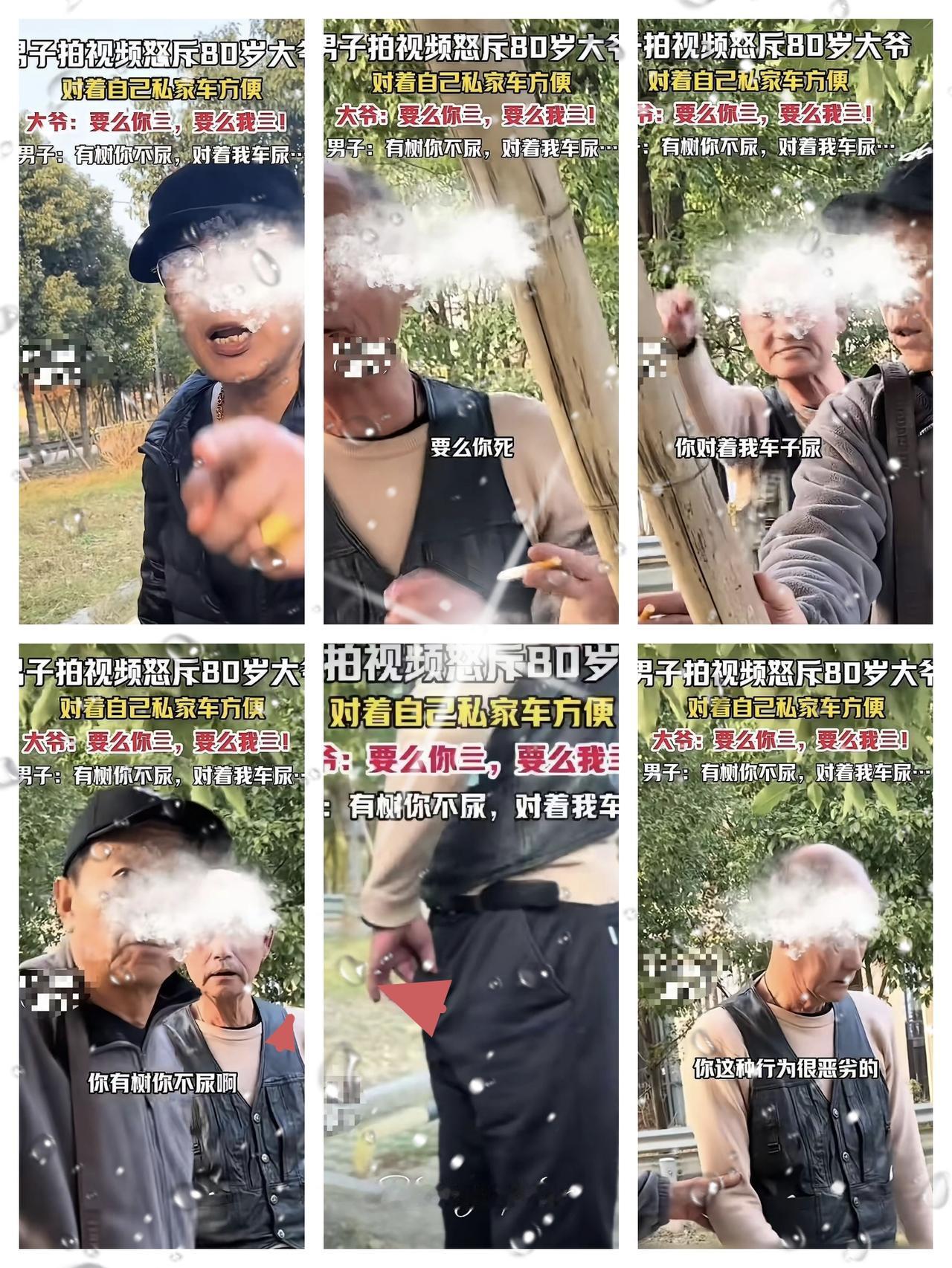真的是坏人变老了! 男子怒斥80岁大爷对着自己私家车尿尿,大爷却放狠话:“要么你死,要么我死!”男子:“有树不尿,对着我车尿……什么人嘛?” 最让人膈应的从不是一时的无心之失,而是明知故犯的恶意与嚣张。两米外就有大树可避人,大爷偏要绕开专挑私家车下手,这份精准的算计,远比单纯的素质低下更刺眼。 面对男子的合理质问,大爷不仅毫无愧疚,反倒恶语相向放狠话,连同伴都上前围堵指责车主,仿佛做错事的从来都不是随地小便的自己。 所谓的“为老不尊”,从来都不是年纪大了就变坏,而是坏了一辈子的人,到老了仗着社会的宽容肆无忌惮。他们吃透了旁人“怕惹麻烦、不敢顶撞老人”的心思,把年纪当成作恶的盾牌,把蛮横当成特权。 网友说自家狗狗都知道找树根方便,这话一点不夸张。比起懵懂的小动物,这些揣着明白装糊涂的老人,缺的从来不是便利的条件,而是最基本的公德心和做人的底线。 现行规则对这类轻微扰民的恶行处罚太轻,才让这些人有恃无恐。尊老从不是纵容恶行的借口,善良守规矩的长者值得敬重,披着白发的无赖不配被迁就。 真正的文明,从来不是谁弱谁有理,而是谁错谁担责。不分年龄大小,不分辈分高低,守住底线才配得到尊重。 大家觉得,面对这种为老不尊的行为,我们该默默忍气吞声,还是勇敢站出来维权?