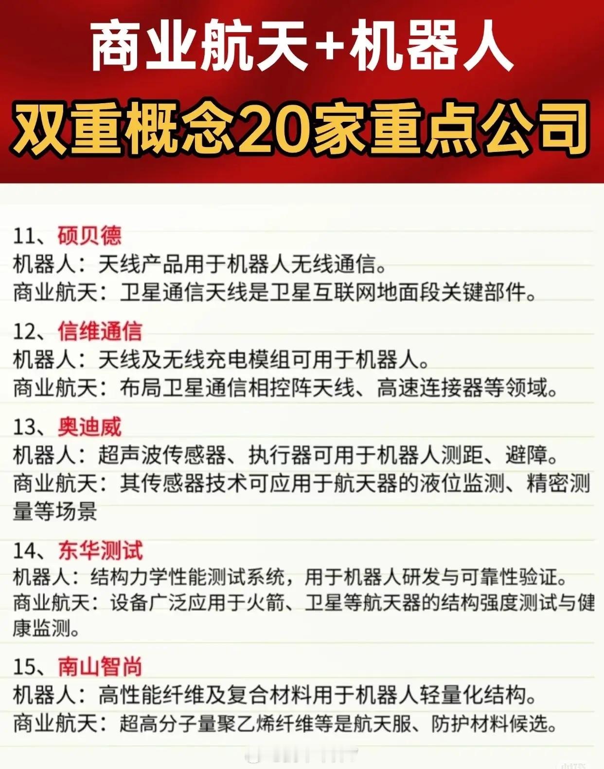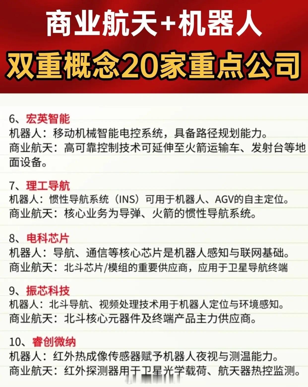 商业航天+机器人双重概念20家重点公司名单及应用方向。核心要点:1.领