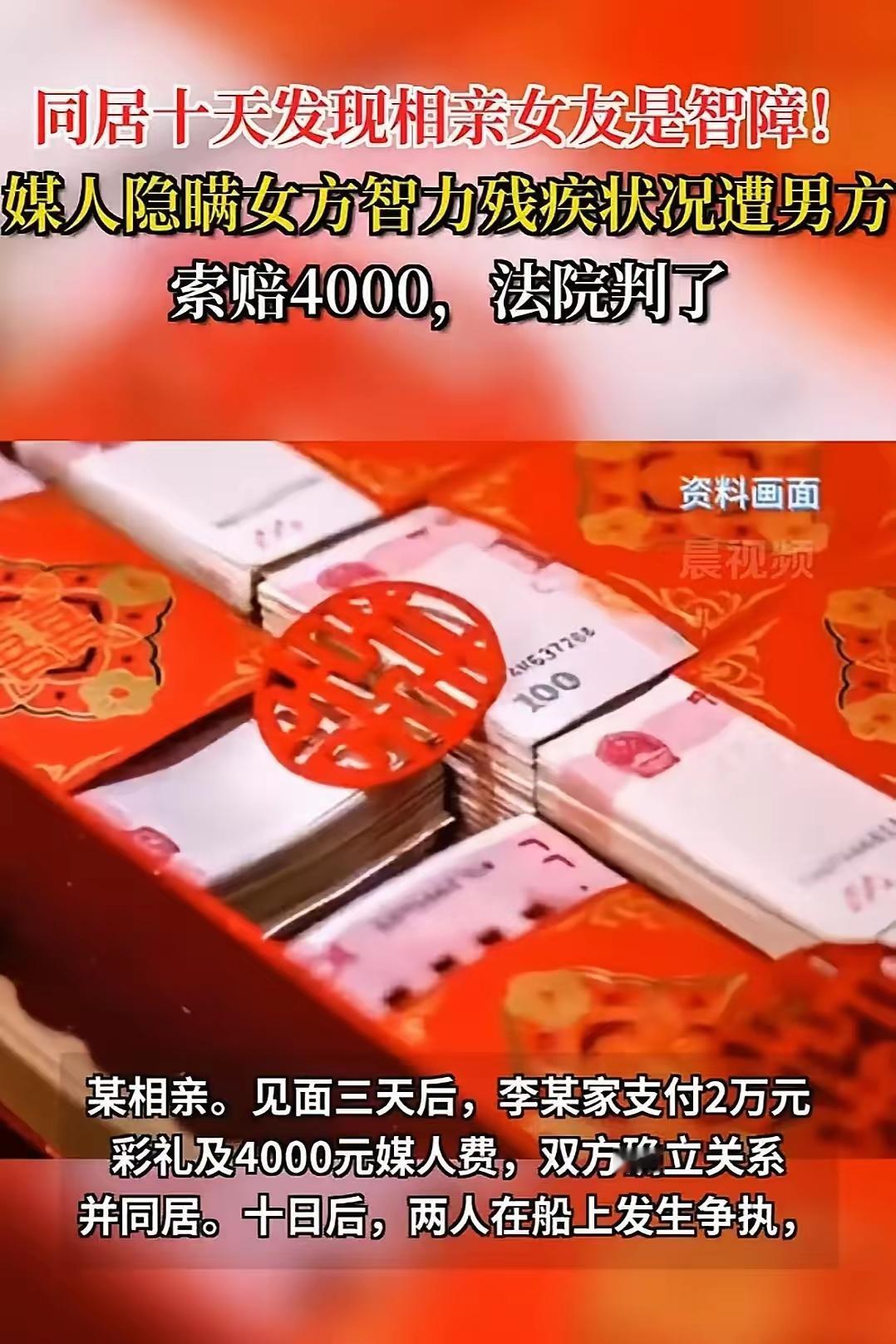 34岁单身汉相亲认识26岁姑娘,彩礼才2万觉得捡了大便宜,4000媒人钱也说给就给。接着就和女生同居试婚。没想到同居10天后发现女友是二级智力残疾! 这男的是真急了。34岁,家里催得紧,碰上年轻漂亮、彩礼不高的,生怕错过。钱给得爽快,生怕对方反悔。结果同居十天,才发现姑娘智力低下。 可姑娘可能更可怜。她懂什么叫结婚吗?很可能是家里觉得是“累赘”,想赶紧找人接手。这十天里,她只是听话跟着走,根本不明白发生了什么。 媒婆呢?眼皮底下的事,她能不知道?要是明知情况还撮合,那就是坏;要是不知道,那也是只收钱不管事的马虎主。那4000块钱,她拿得安心吗? 最后法院判退一半彩礼,男方花一万块钱买了十天教训。可女方往后怎么办,好像没人在意。 所以说,天上不会掉馅饼。越是着急结婚,越得擦亮眼。你以为捡了便宜,搞不好跳进的是个坑。婚事,真急不得。