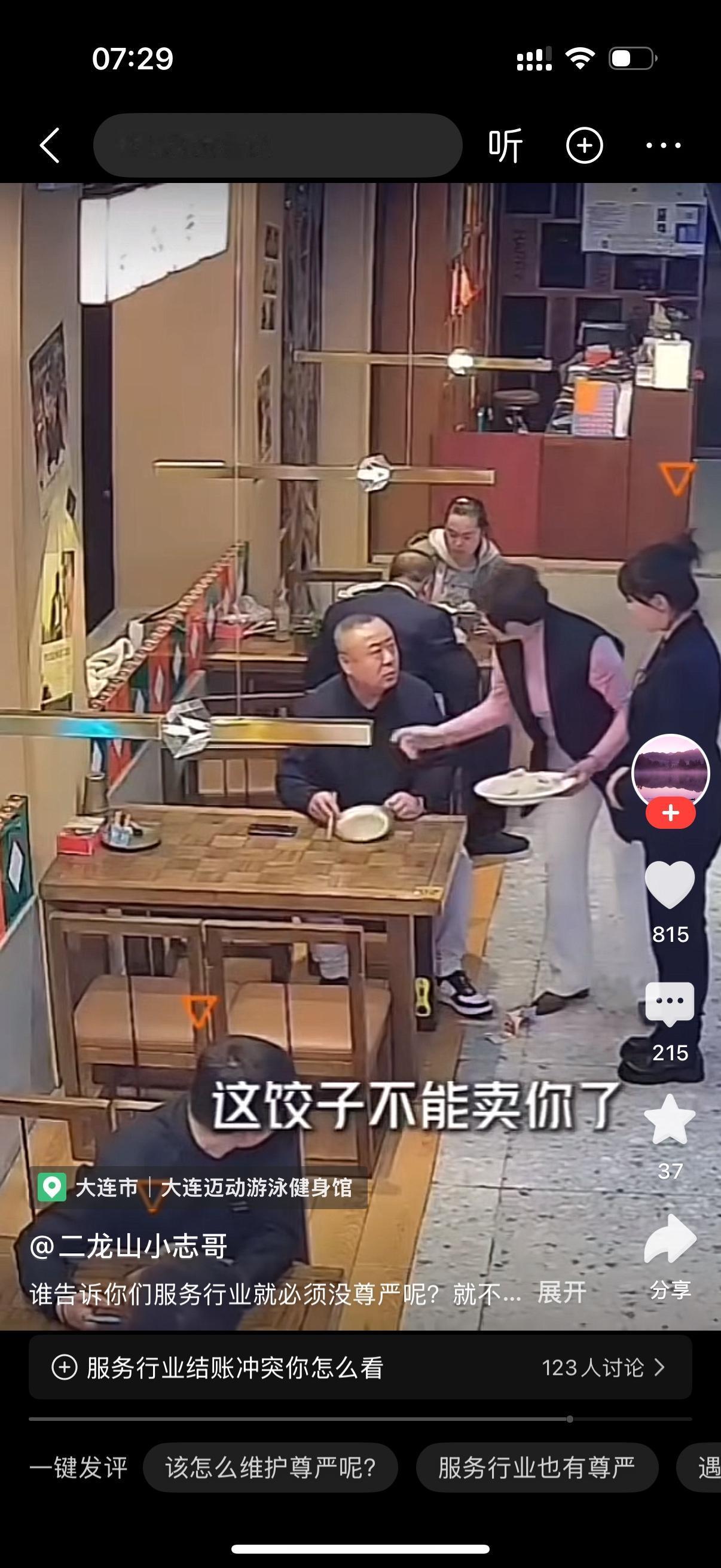 服务员端着饺子从大爷身边经过。大爷用筷子敲着盘子,大声喊,往哪端的这饺子?服务员小心翼翼地给大爷上饺子,示意大爷去前台买单。大爷大怒,我都没吃,买什么单?服务员解释本店是先买单再就餐。大爷气哄哄地把钱扔地上。服务员正想弯腰去捡钱,老板娘跑过来把她拦住。老板娘直接把大爷的饺子收走,说这饺子不能卖你了。大爷脸都绿了。