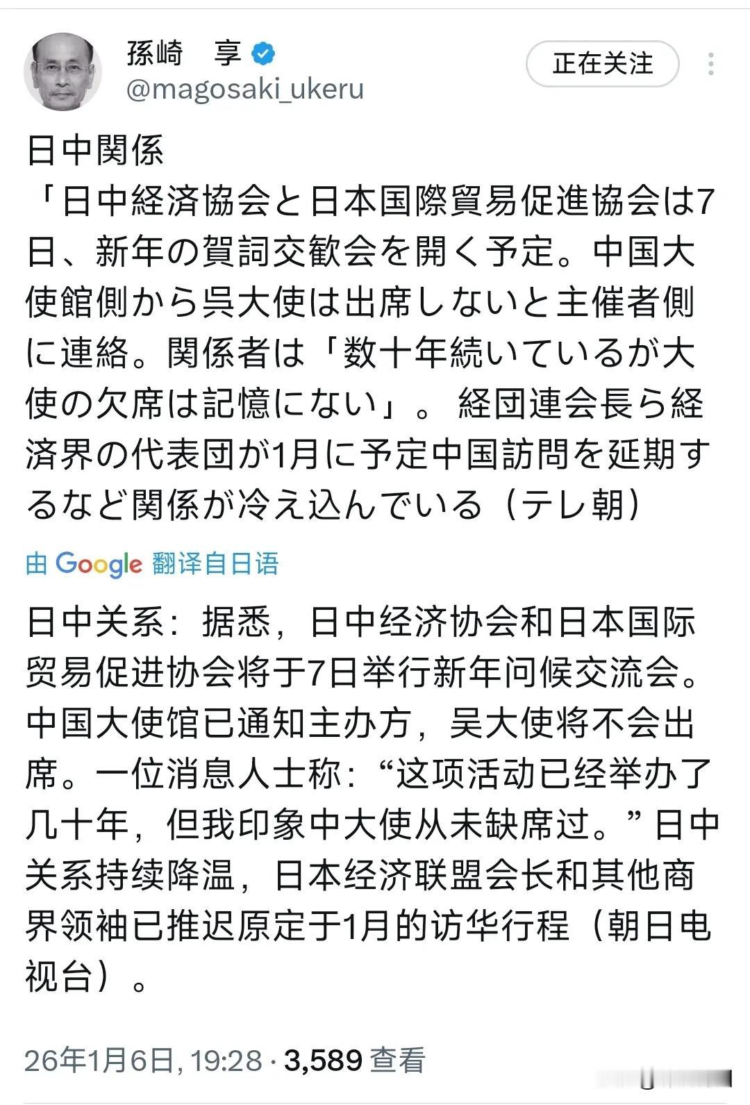 日本东亚共同体研究所所长、原日本外务省国际情报局局长孙崎享昨晚(1月6日晚)写道:“日中关系:据悉,日中经济协会和日本国际贸易促进协会将于7日举行新年问候交流会。中国大使馆已通知主办方,吴江浩大使将不会出席。一位消息人士称:‘这项活动已经举办了几十年,但我印象中大使从未缺席过。’日中关系持续降温,日本经济联盟会长和其他商界领袖已推迟原定于1月的访华行程。” 评几句: 这项办了几十年的活动,大使从未缺席,堪称中日经贸交流的年度风向标,如今打破惯例,背后是中日关系持续降温的冰冷现实。 更关键的是,日本经济联盟等商界团体原定于1月的访华行程已推迟,商界之路彻底遇阻!要知道这一年度访华机制自1975年起几乎从未中断!根源很明确:此前日本首相高市早苗公然将“台湾有事”与日本“存亡危机”挂钩,触碰中方核心红线,这是中方绝不容忍的底线问题。 中方态度早已亮明:政治纠错在先,经贸交流在后!吴江浩大使缺席、访华行程搁浅,都是对日本错误言行的直接回应。日本想既要政治挑衅,又要经贸红利?这种“两头占”的算盘,中方绝不答应!