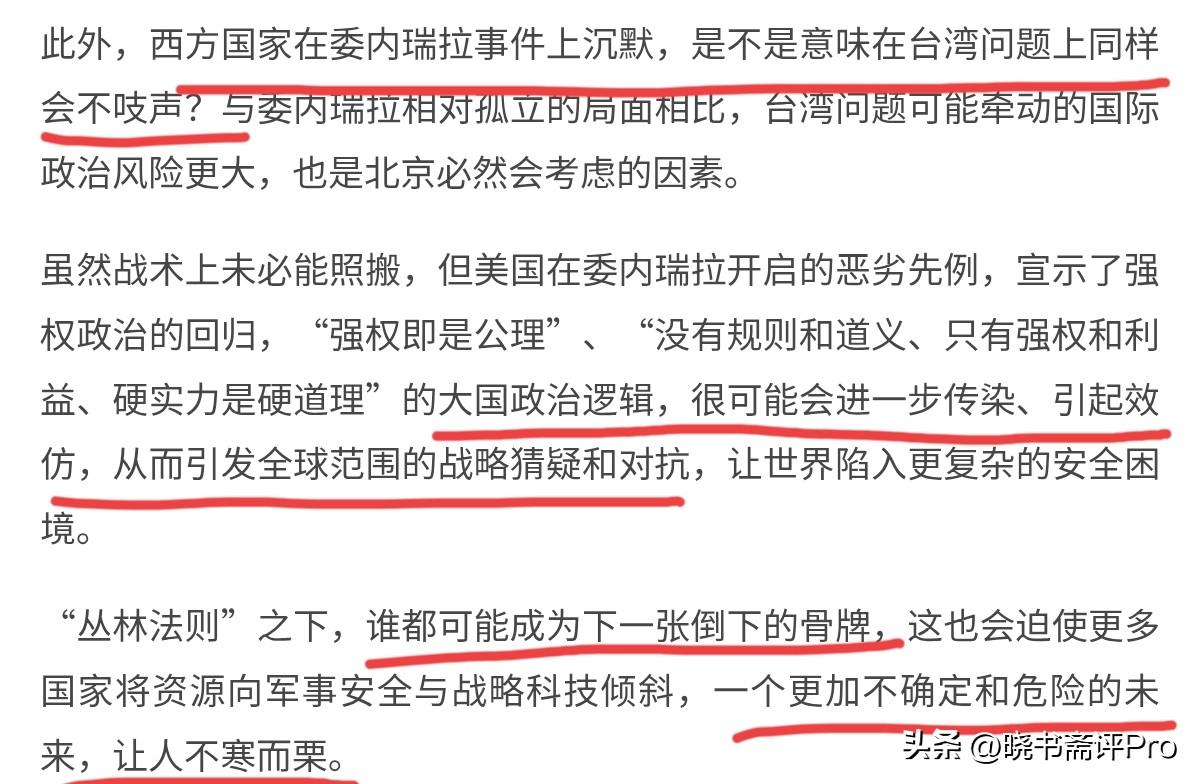联合早报又开始阴阳我们了!1月7日,联合早报刊文声称,中国虽然战术上未必能照搬,但美国在委内瑞拉开启的恶劣先例,宣示了强权政治的回归,“强权即是公理”、“没有规则和道义、只有强权和利益、硬实力是硬道理”的大国政治逻辑,很可能会进一步传染、引起效仿。从而引发全球范围的战略猜疑和对抗,让世界陷入更复杂的安全困境。 联合早报同时提醒称,西方国家在委内瑞拉事件上沉默,是不是意味在台湾问题上同样会不吱声?与委内瑞拉相对孤立的局面相比,台湾问题可能牵动的国际政治风险更大,恐怕这也是北京必然会考虑的因素。很显然,明明是美国破坏国际规则,联合早报明显是在暗示,我们也可能这样做。 不过,我们倒是奇怪的是,不管我们会不会采用斩首战术,这跟“没有规则和道义、只有强权和利益、硬实力是硬道理”的大国政治逻辑”有什么关系呢?联合早报难道不知道台湾是中国的一部分吗?中国实现国家统一合情合理,难道在联合早报看来,我们这是破坏国际法的“侵略”行径吗?这不是非常的荒唐吗? 再者,联合早报暗示如果我们使用该战术,西方国家不会沉默,那联合早报借此传递的信息是什么呢?既然西方国家对于美国破坏国际规则都装聋作哑,正常的逻辑,难道不是他们应该更加的闭嘴吗?联合早报这一点都看不明白吗?说白了,新加坡作为一个小国害怕国际社会越来越没有规则。 但是新加坡不敢谴责美国,新加坡媒体选择的却是阴阳我们可能的霸权行径,这我们当然不能接受。当然,对于台湾问题,新加坡别嘴上承认一个中国原则,私底下各种碎嘴。新加坡对于台湾问题,正确的立场就是乐见我们统一,不要把我们当成是另外一个美国。事实上,我们本来就不是美国,不会奉行霸权逻辑,新加坡媒体的心态还是应该健康一点。