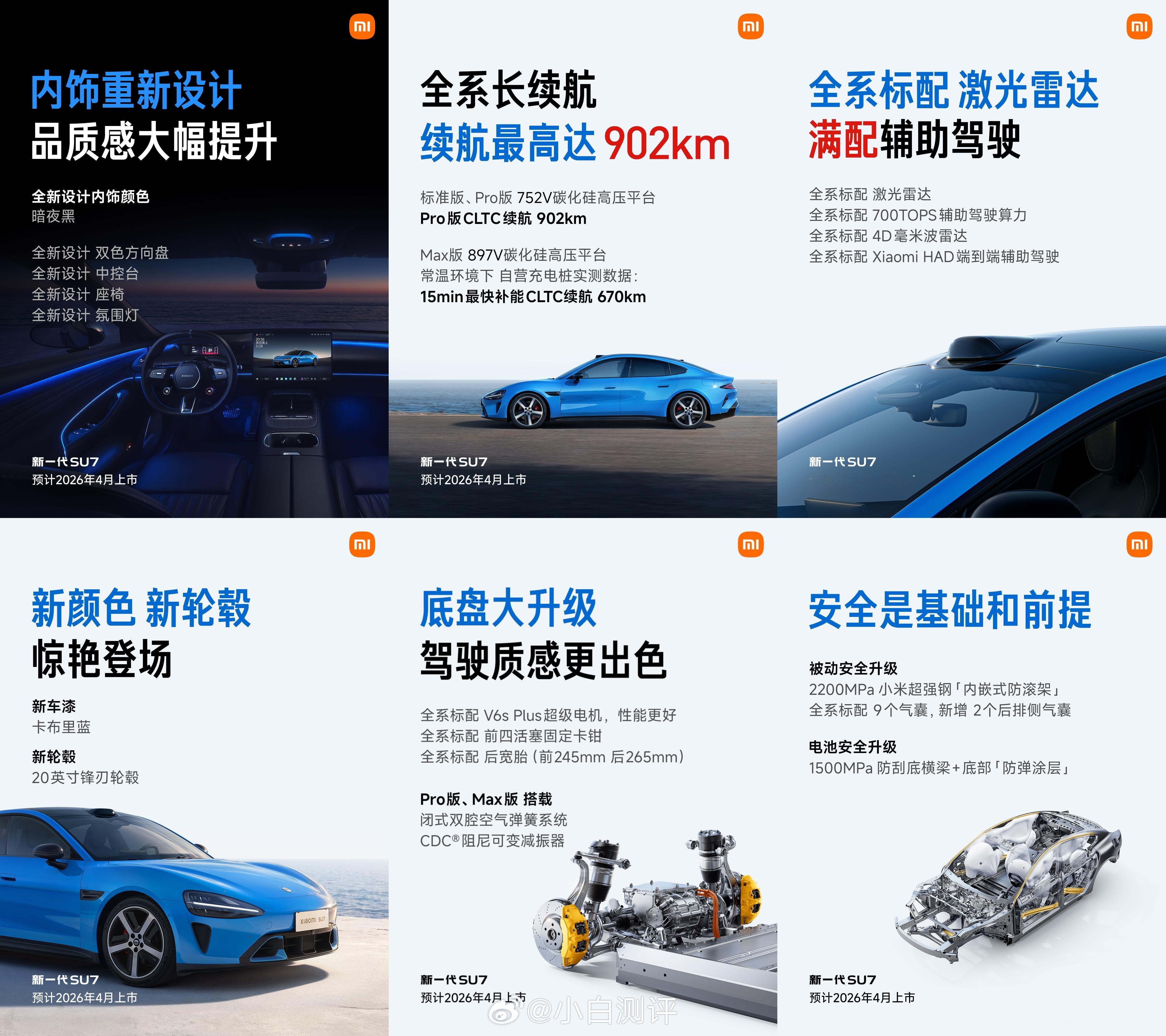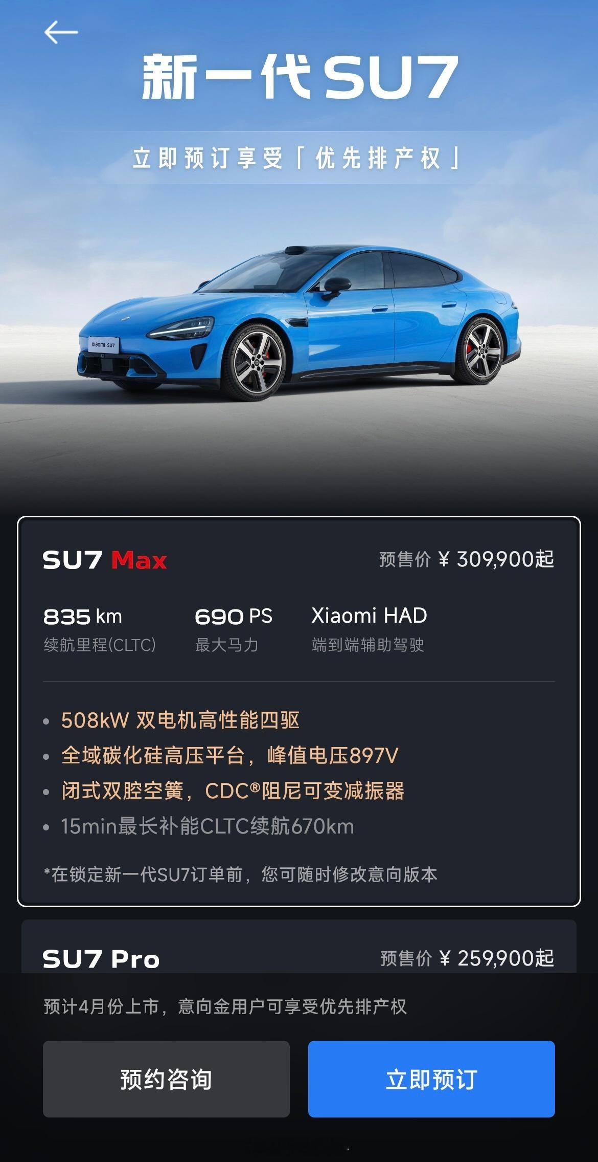 新一代小米SU7预售22.99万元起 小米SU7改款开启小订了标准版22.99万元起Pro版25.99万元起Max版30.99万元起锁单未交付SU7车主可限时升级有打算定的吗?