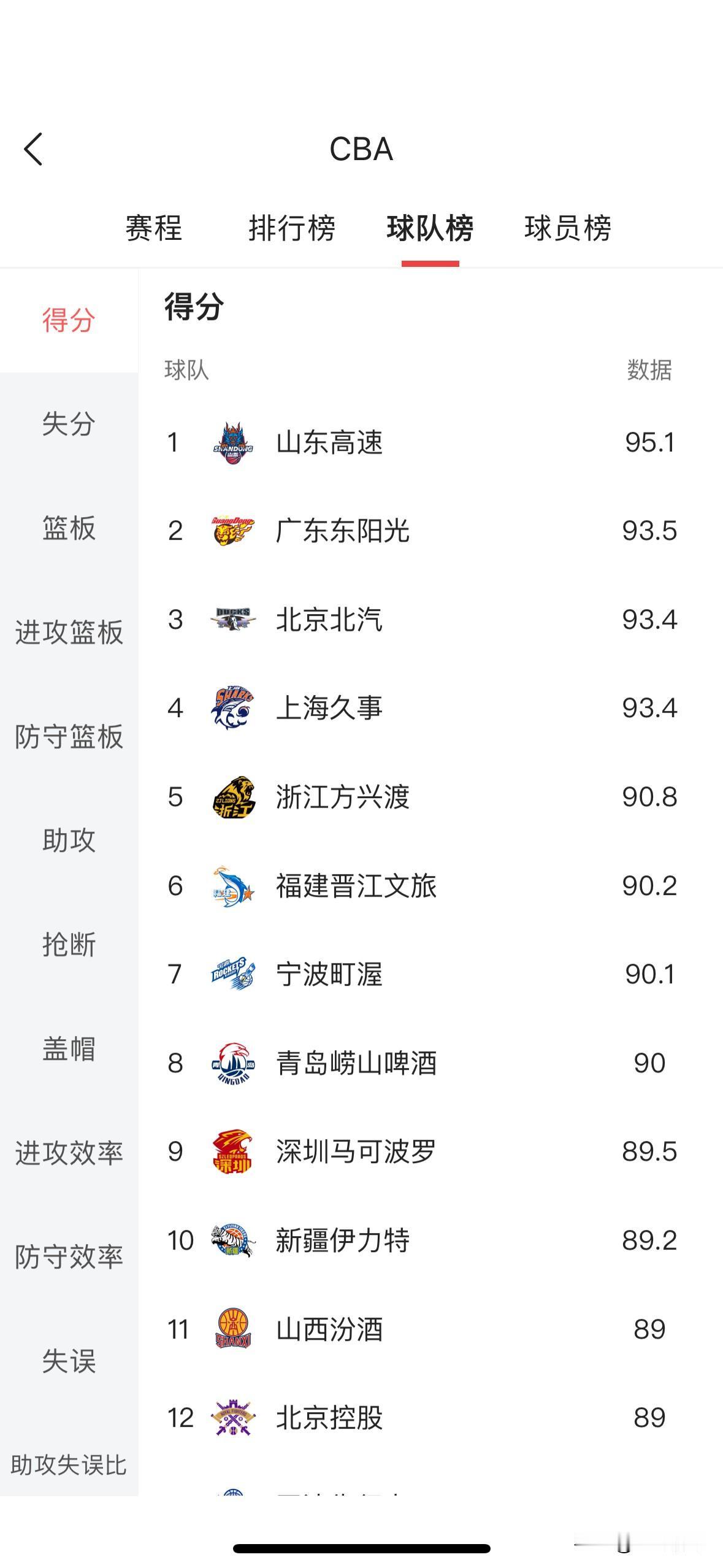 山东高速荣登榜首!CBA截止第十二轮最新的球队场均得分榜数据来了,山东高速男篮场均95.1分荣登榜首,广东宏远93.5分屈居第二,第三则是北京首钢93.4分,接下来依次为:上海久事、浙江广厦、福建晋江、宁波町渥、青岛崂山!