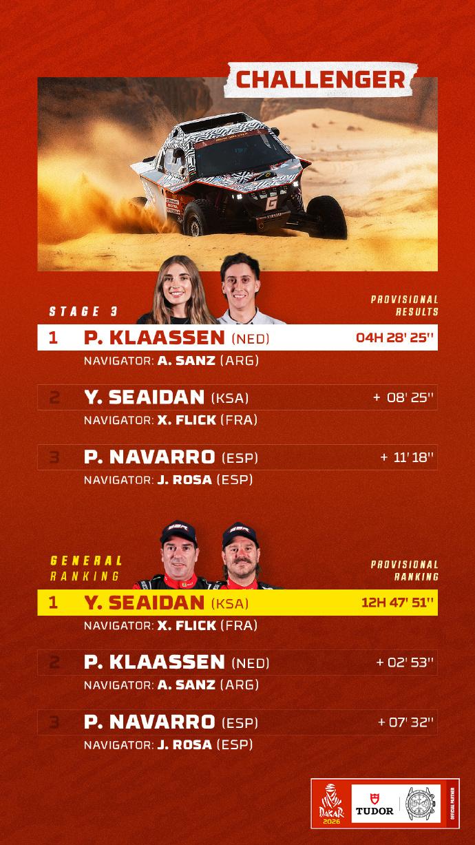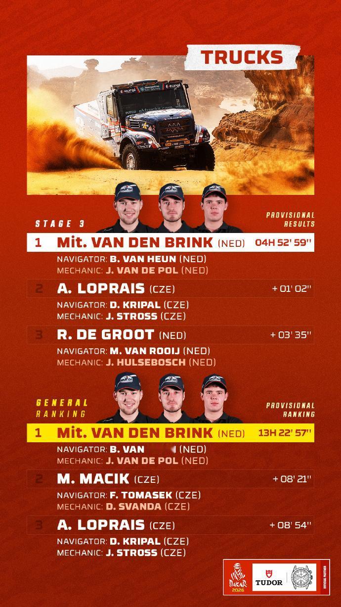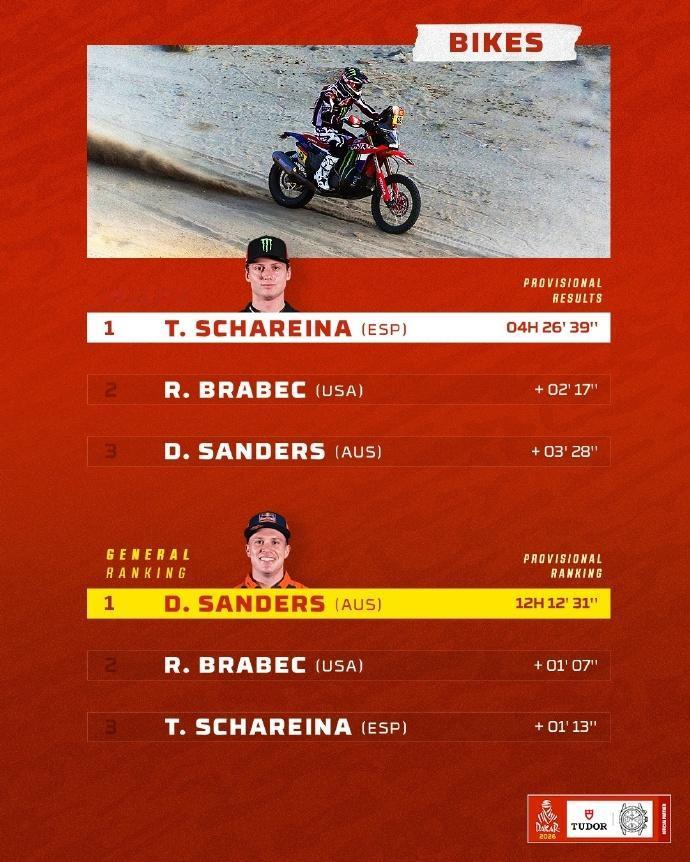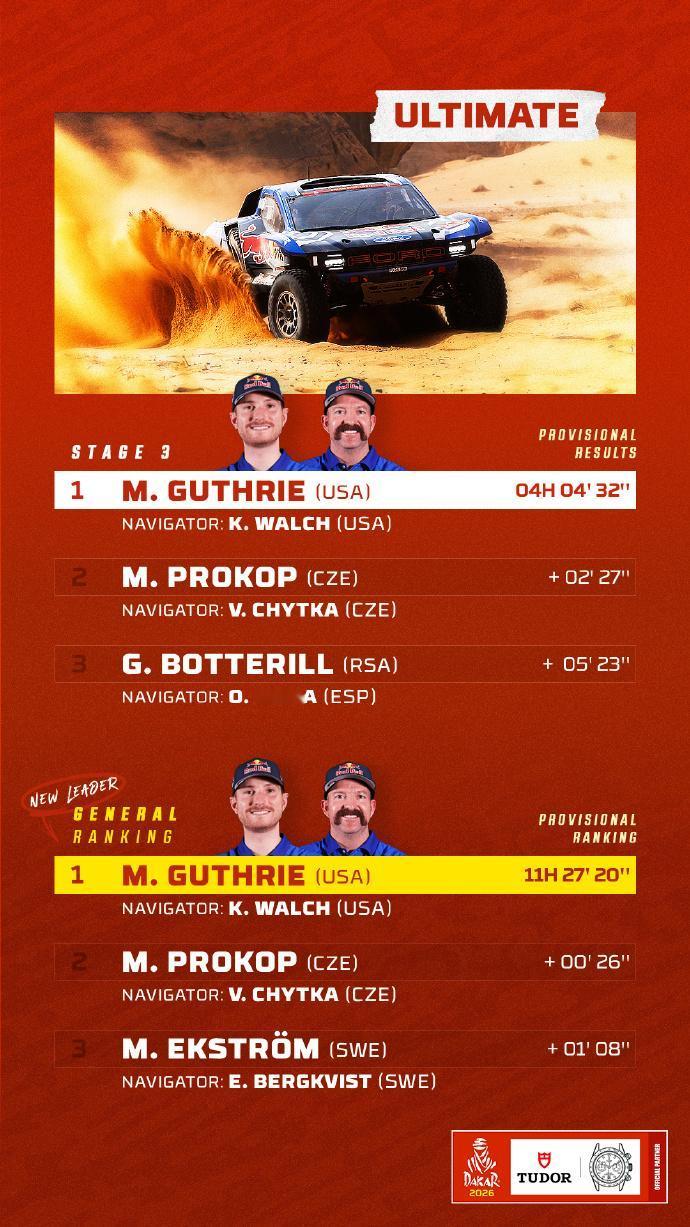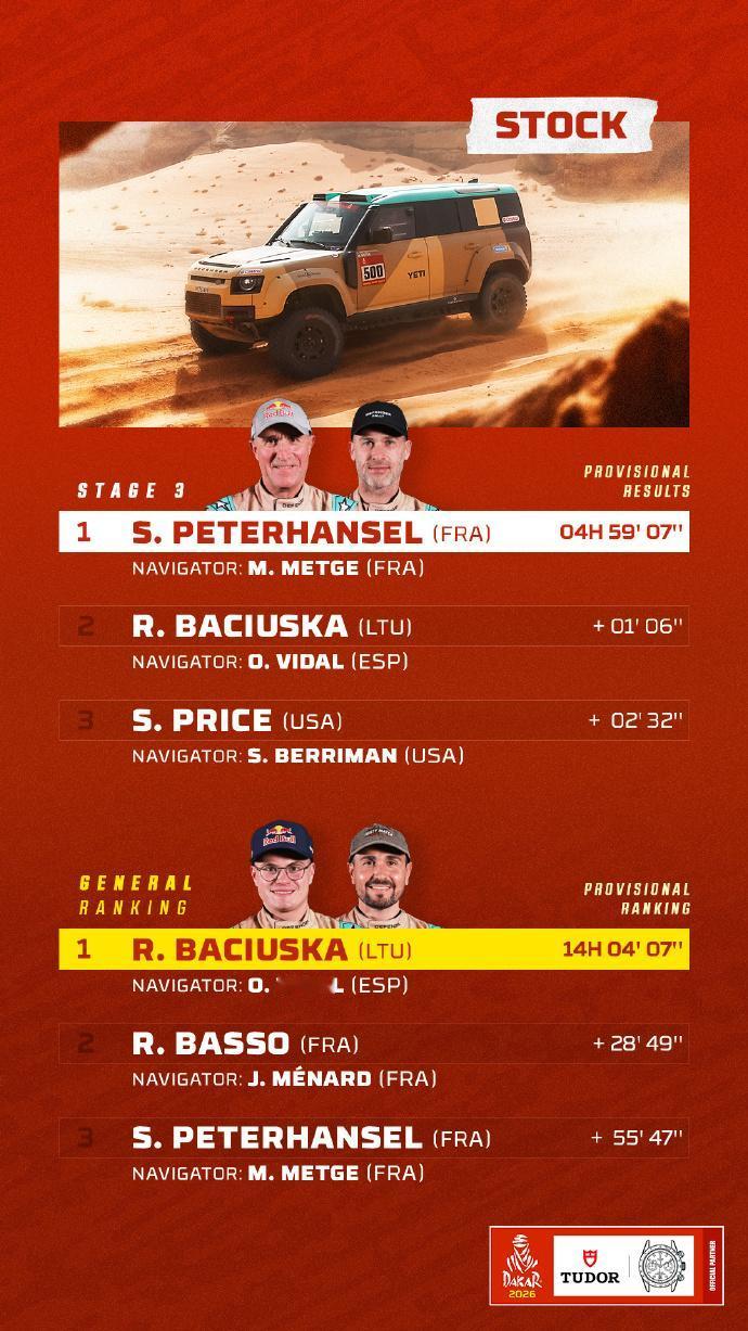 赛车:2026达喀尔第3赛段战报 北京时间1月6日,2026达喀尔拉力赛结束第三赛段的角逐。 第3赛段介绍 阿尔乌拉 ➡️ 阿尔乌拉 🛣 行驶路段:315公里 - 特殊赛段:421公里 🕒 发车时间(格林尼治时间+3): 🏍 摩托车组:07:30 🚗 汽车组:09:44 摩托车组方面,多位车手今天出现摔车,艾伯斯特手腕骨折,斯维特克右肩受伤,遗憾退赛。沙雷纳摔车后依然能够取得赛段胜利,上升到总榜第三。桑德斯和布拉贝克暂列总榜前二,这三位车手的差距只有1分13秒而已。 汽车组方面,阿尔阿提亚、勒布、金特罗和德梅乌斯等名将都饱受爆胎困扰。格思里获得赛段胜利后领跑总榜,福特目前包揽了总成绩榜前5。去年总冠军阿尔拉吉已经落后近30分钟,排在总榜第19名。 6个组别TOP3得主👇 🚗 T1组:福特车手格思里最快,并领跑总成绩 🚘量产T2组:彼得汉塞尔最快 ,罗卡斯领跑总成绩 🏍️摩托车组:沙雷纳最快,桑德斯领跑总成绩 中国军团方面,汽车组九江车队的范高翔,以赛段第21名完赛,是当日中国军团中成绩最好的车手。目前他在总成绩上排名第25名;韩魏在SS3赛段排名第31名。 摩托车组凯越车手苏尼尔SS3被罚15分钟,赛段排名第58位。