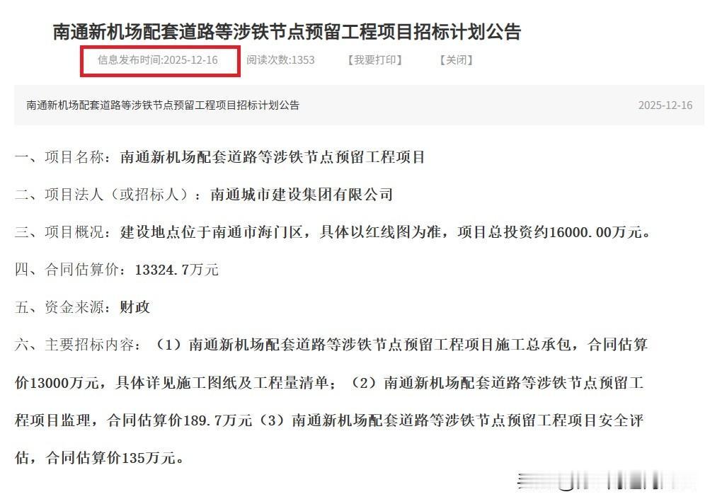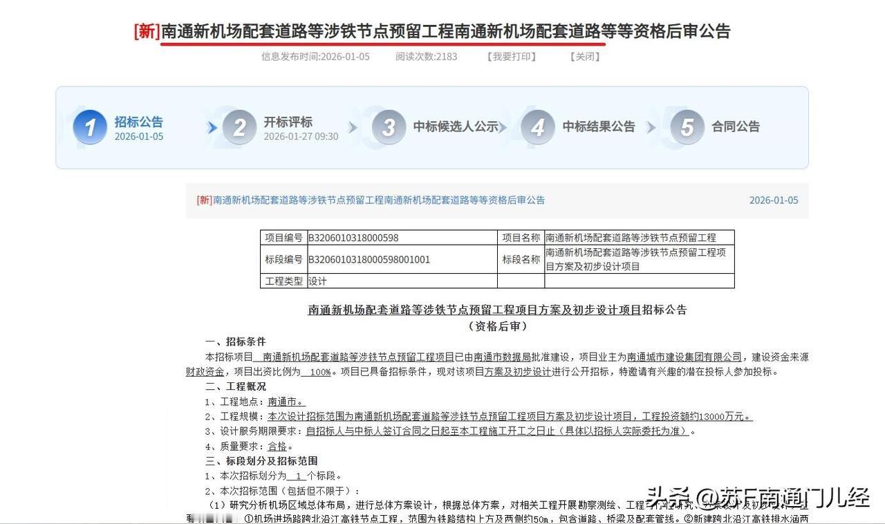 近日关于南通新机场配套道路工程的一则公告里,点明了南通新机场将于2027年全面开