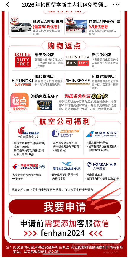 【2026奋韩留学大礼包,3月入学的新生免费领取啦!】准备来韩国留学的你,这一份一定别错过👇由【奋斗在韩国】联合多方机构共同推出的2026 留学新生大礼包将于1月5日正式上线,面向即将赴韩的语学院 / 本科 / 硕士 / 博士新生,免费申领,限量发放!📦 大礼包内含:✔ 韩国电话卡 / 交通卡✔ 留学实用手册 & 防诈骗安全指南✔ 行李牌、护照夹、实用周边✔ 多家合作平台福利优惠📌 申领方式:(见图)入【奋斗在韩国 App】活动入口填写信息,上传录取通知书即可申请,通过后统一邮寄到国内地址。🎉 隐藏福利:成功申领并转发活动至小红书 / 微博 / 新生群 / 朋友圈,还有机会参与抽奖,赢行李箱 & 官方周边好礼!⏰ 数量有限,先到先得📣 申领入口(网页链接)