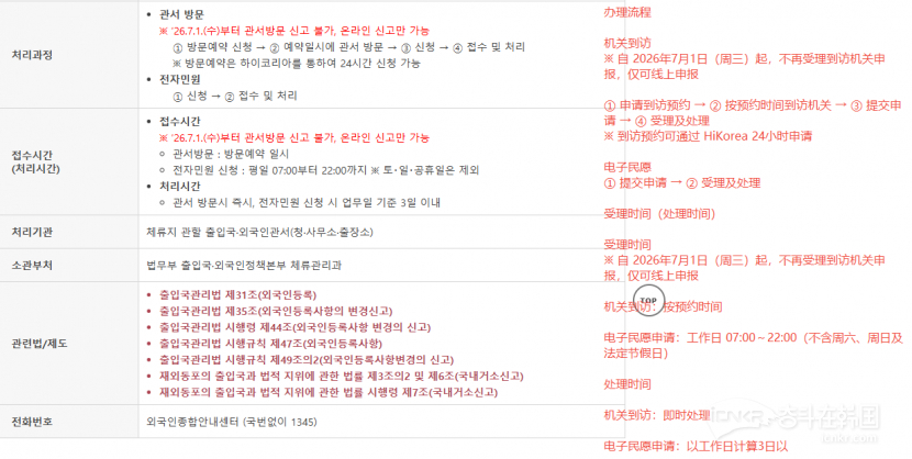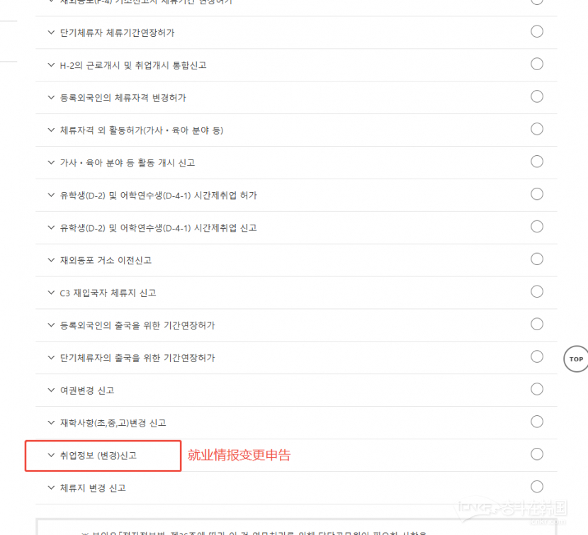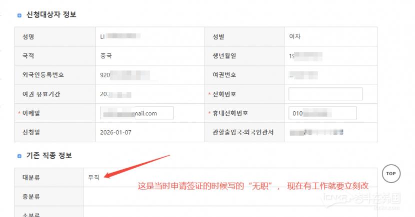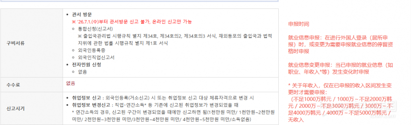 【在韩国的外国人注意!这几种签证的就业信息必须申报,申报流程快码住!❗】海外新鲜事热点现场 2026年1月2日开始,韩国对外国人就业信息变更申报制度进行了完善,如果在15天之内没有申报,或将面临100w韩元罚款!🧾 什么是就业信息(变更)申报?👉 新申报第一次登记就业信息👉 变更申报之前申报过,但现在信息发生变化了。比如职业种类或者年薪发生变化。👥 哪些签证必须申报?以下签证类型都在申报义务范围内主驻人员 D-7企业投资 D-8贸易经营 D-9教授 E-1 ~ 船员就业 E-10居住 F-2在外同胞 F-4结婚移民 F-6访问就业 H-2👉 只要你是这些签证之一,发生变化就必须报!!这里说的「就业信息」❌ 不是公司名字 / 工作单位,✅ 而是:职业类别和行业类型🧾 什么情况需要申报就业信息?👉 第一次申报做外国人登录 / 居所申报时或更换为【需要申报就业信息】的签证类型时👉 变更申报工作内容变了职业变了年收入区间变了年收入只有跨区间才需要申报比如:✔️ 1000万 → 2000万(要报)❌ 同一档里涨工资(不用报)💰 年收入区间是这样分的1000万韩元以下1000万~2000万以下2000万~3000万以下3000万~4000万以下4000万~5000万以下无收入🚨 重点变化一定要看!📅 从 2026年7月1日开始❌ 不能再去出入境现场申报 ✅ 只能线上申报(hikorea)💸 费用多少?✅ 全程免费!🚨线上申报怎么进行?教程来咯~(详情见图,带翻译)1 进入hikorea网站,点击第一项전자민원2 点击职业情报变更(申报)3 我在这里做了翻译,请大家看中文更能理解4 如果这里显示的职业状态和现在不同,就需要进行职业变成申报5 开始进行职业变更申报 ,找到你现在工作的职种和工种进行选择,并选择你的工资区间。6 提交后7 确认书8 等待审核,大概3个工作日在hikorea上查看审核结果。如果需要补交材料,工作人员会联系您。