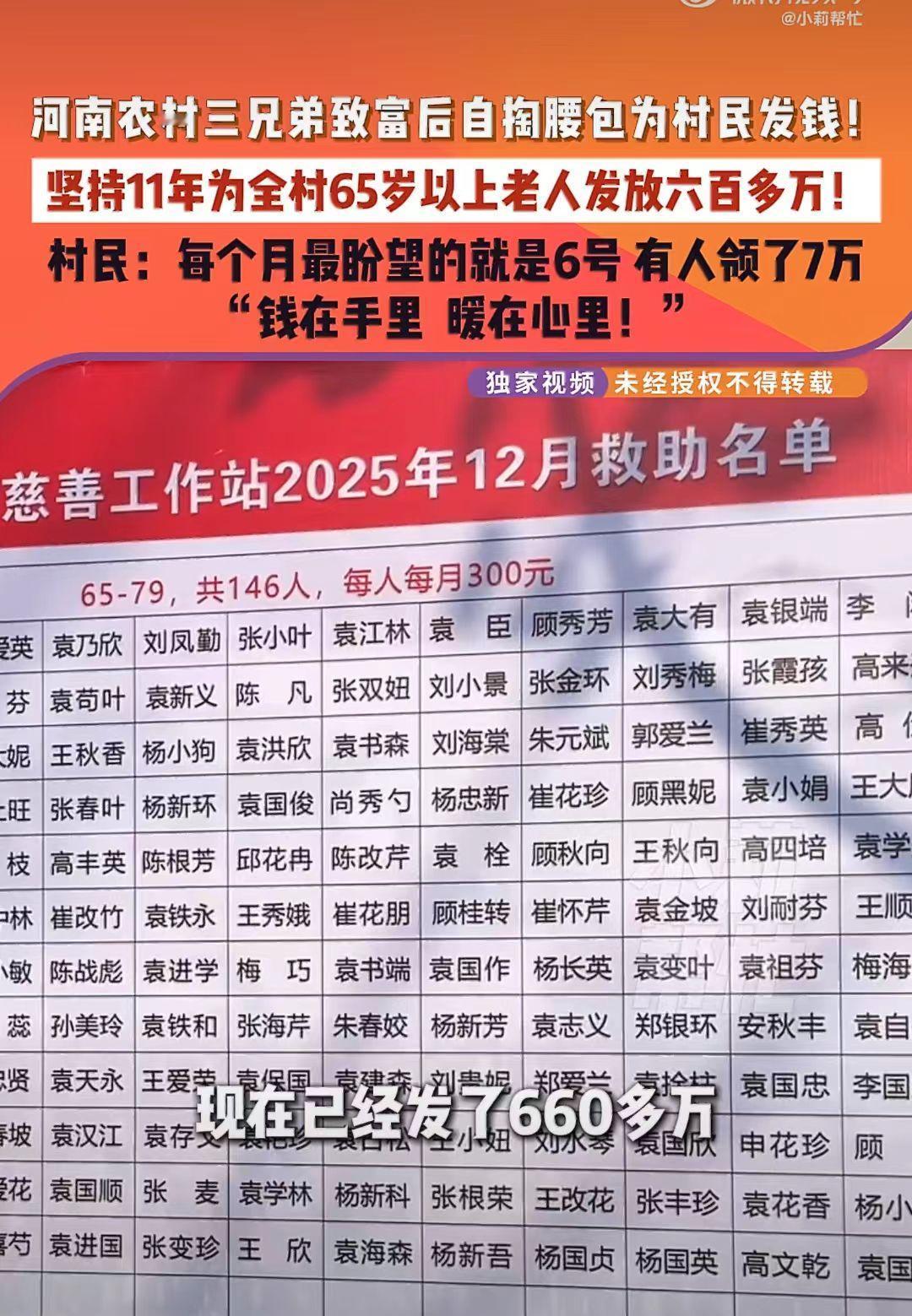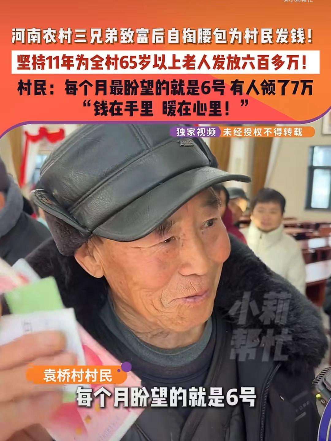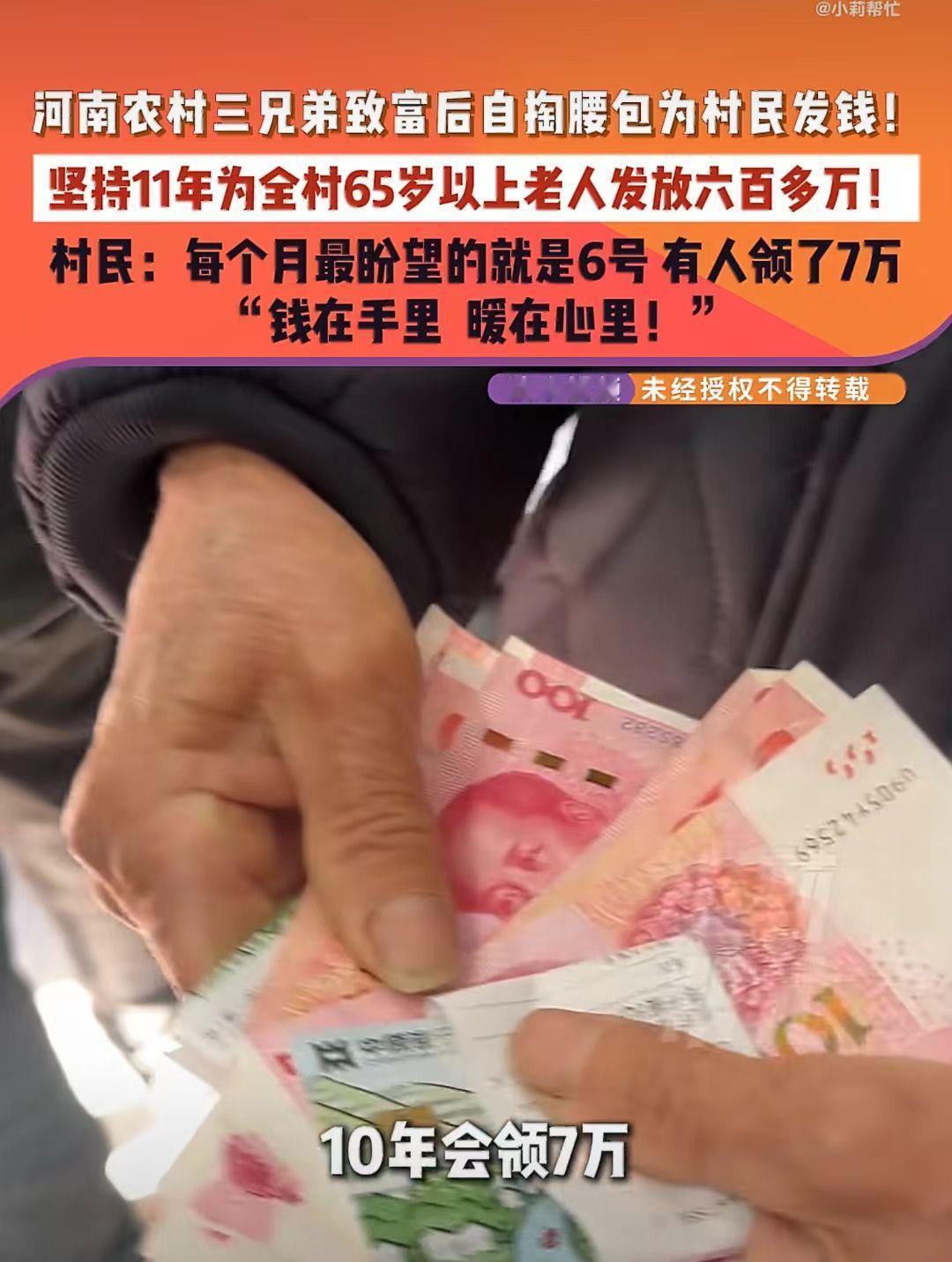 河南登封,农村兄弟三人有钱后, 每月6号给全村65岁以上的170多位老人发现金, 65岁到79岁每月发300元,80到89岁发放500元,90岁以上每月1000元。 坚持了11年,累计发放600万。 领的最多的已经达到7万元。 老人们每个月最高兴的是6号,是他们;领钱改善生活的日子。 三兄弟还在本村设立了大病救助站,帮助那些生病的家庭。 从一开始的120人,到现在的170多人。 真的是“钱在手里,暖在心里。”农村老人补贴 老人发钱 河南发钱