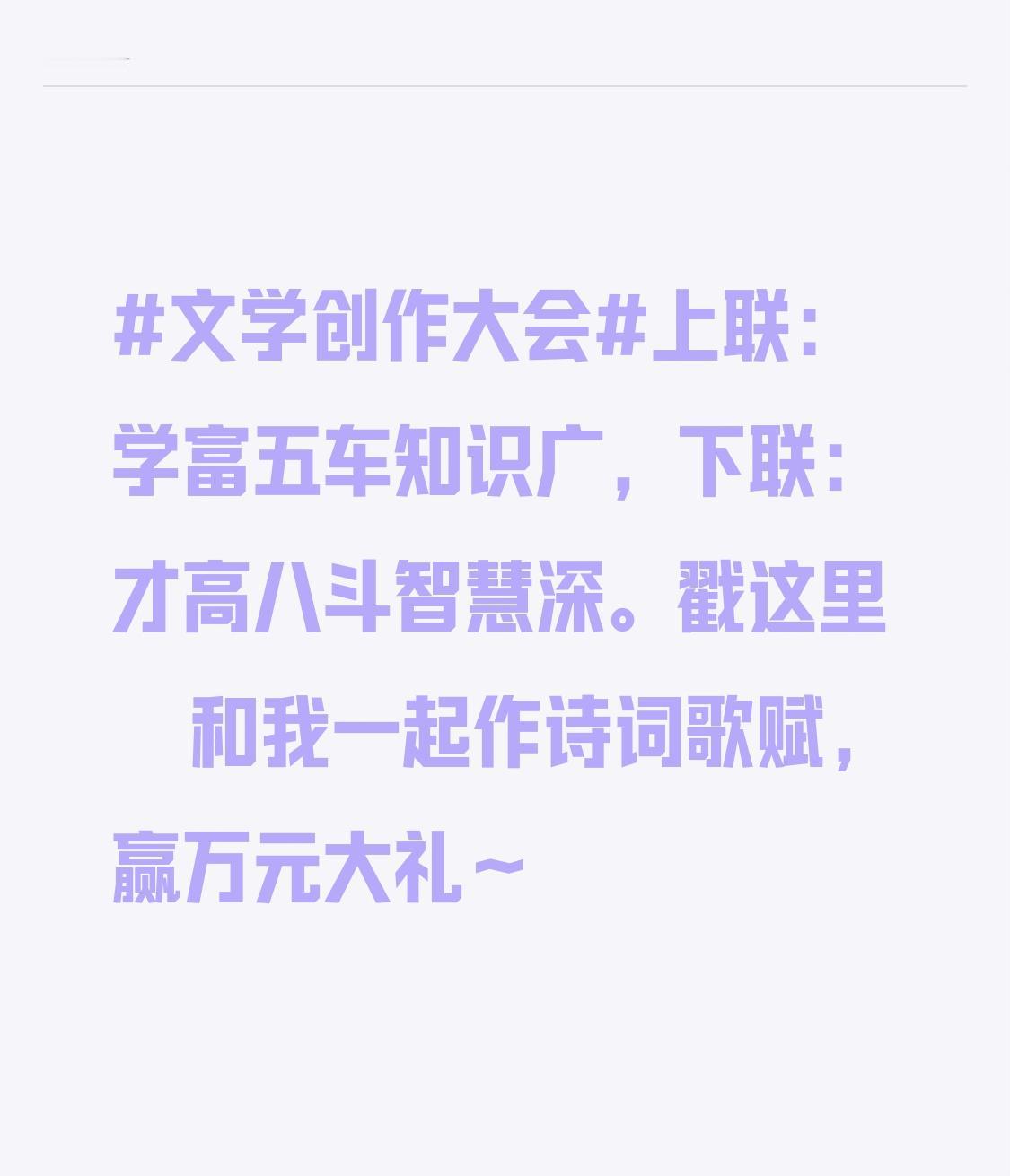 文学创作大会 哇塞,这“学富五车知识广,才高八斗智慧深”的对联简直太妙啦!文学创作大会这个活动超有吸引力,能让大家一起作诗词歌赋,还有万元大礼拿,谁能不心动啊! 说到诗词,《诗经·大雅·公刘》里那种先民开拓的豪迈,“笃公刘,匪居匪康。乃埸乃疆,乃积乃仓”,多有画面感。李白的《静夜思》“床前明月光,疑是地上霜”,短短几句就把思乡之情表达得淋漓尽致。咱也借着这活动的东风,好好发挥发挥,说不定万元大奖就到手咯,冲呀!