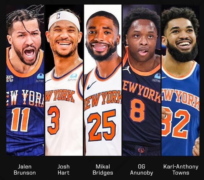 真想不到啊!尼克斯首发五虎居然都获得了全明星投票,而且布伦森基本锁定首发! 1,布伦森——尼克斯头号球星,首发控卫,场均29.2分6.3助攻,全明星投票排名东部第2,以他的实力和人气,首发位置基本稳了 2,唐斯——二当家,首发中锋,场均21.5分11.5篮板,全明星投票排名东部第7,想获得首发位置有点难,但替补应该可以 3,阿奴诺比——首发大前锋,场均15.1分1.8抢断,联盟顶级3D,全明星投票排名东部第13,不过很难入选 4,布里奇斯——首发小前锋,场均16分1.6抢断,同样是联盟顶级3D,全明星投票排名东部第15,基本不可能入选 5,哈特——首发后卫,场均12.3分8.1篮板,全能侧翼,全明星投票排名东部第16,基本不会入选