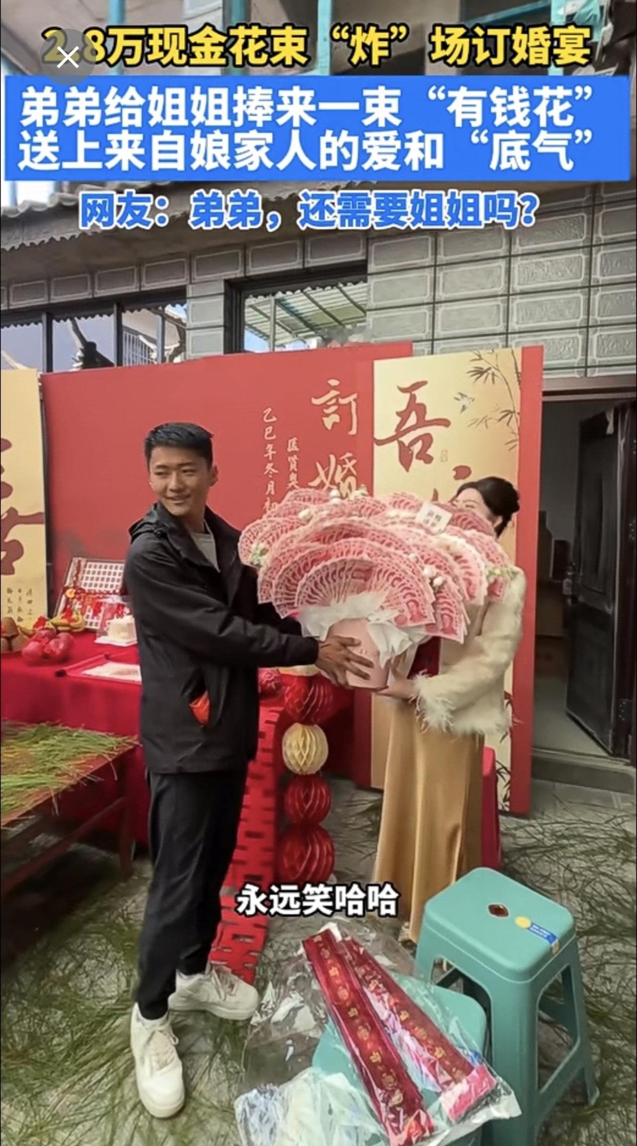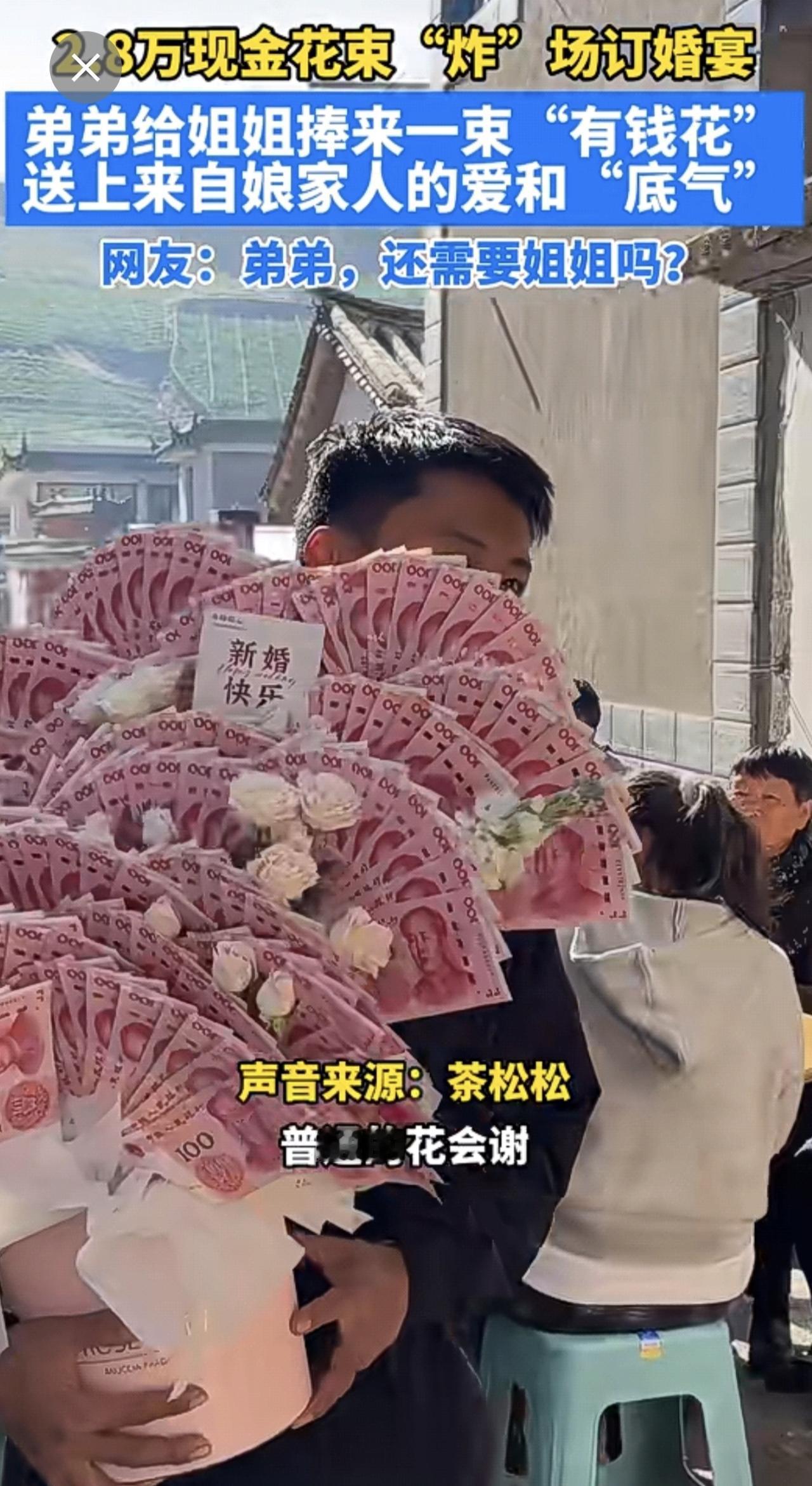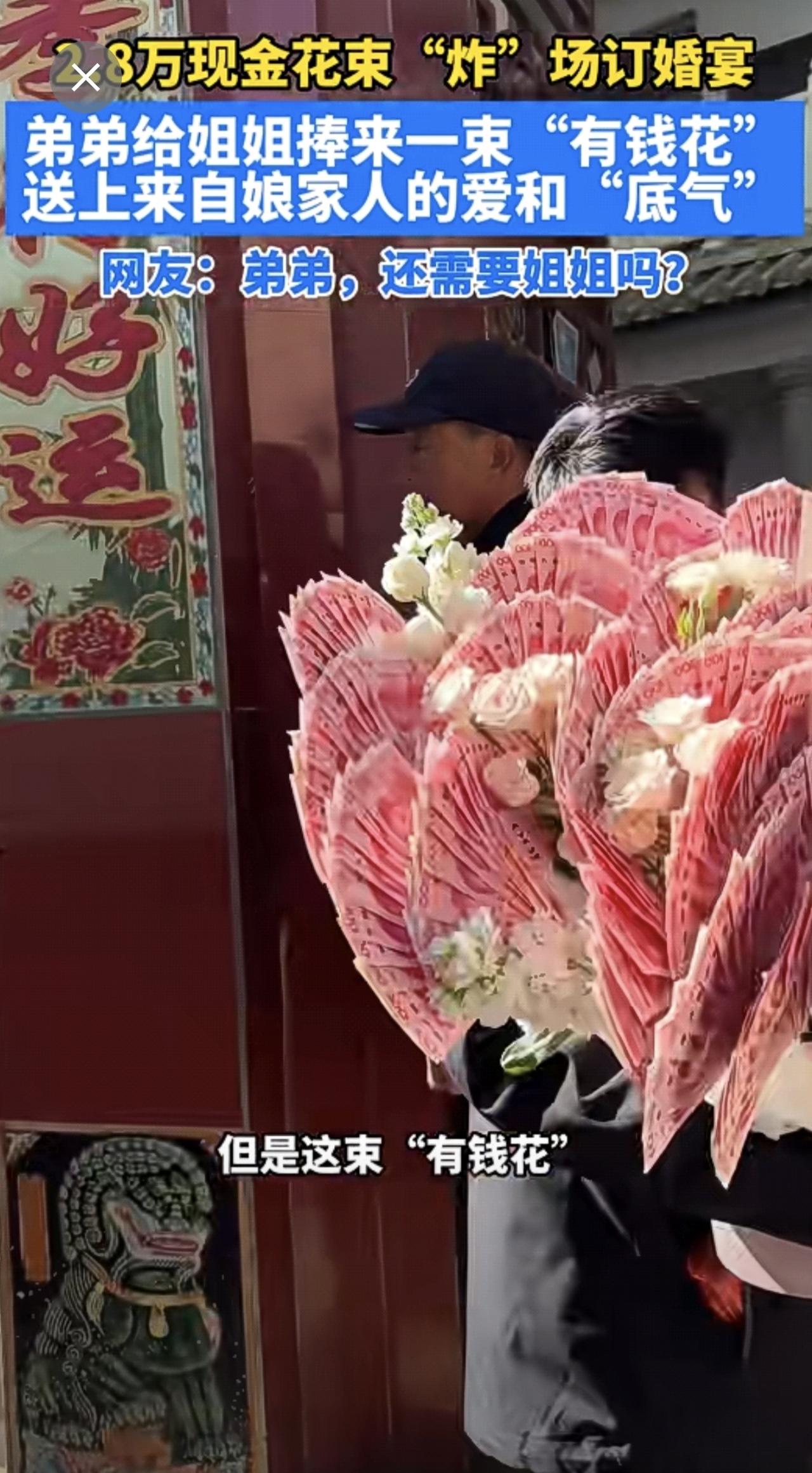 2.8万现金花束“炸”场订婚宴,弟弟给姐姐捧来一束“有钱花”,送上来自娘家人的爱和“底气”,网友:弟弟,还需要姐姐吗?订婚有钱花娘家人姐弟 (来源:松松 记者:施文哲 责编:董珍珍 审核:金飞芬 监制:赵刚 管智勇)