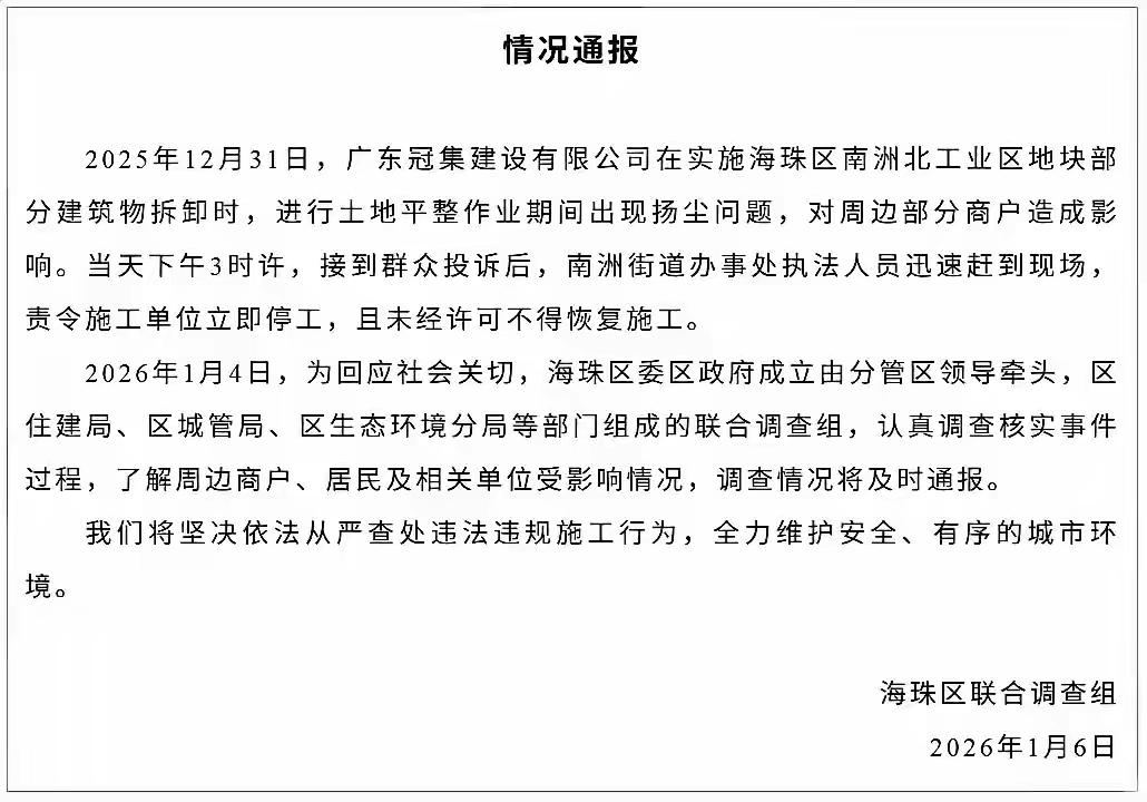 广州海珠施工扬尘扰民!涉事企业注册资本1.38亿,实缴600万,公司9人,拿下189个政府项目,官方已成立调查组严查 2025年最后一天,广州海珠区南洲北工业区的一场施工,让周边商户和居民过了个糟心年。 广东冠集建设有限公司在拆除建筑物、平整土地时,产生大量扬尘,漫天灰雾笼罩街道,车辆在尘雾中几乎看不清前路,周边商户的正常经营也受严重影响。 群众下午3点投诉后,南洲街道执法人员迅速到场,责令施工单位立即停工,且未经许可不得复工。但事件并未就此平息,引发社会广泛关注。 2026年1月4日,海珠区委区政府成立由分管区领导牵头,区住建局、城管局、生态环境分局等部门组成的联合调查组,全面核查事件经过,摸排周边受影响情况。 据工商信息显示,涉事的广东冠集建设有限公司成立于2018年,注册资本达1.38亿元,实缴600万元,曾用名为广东联建建设工程有限公司。 目前调查仍在进行中,官方表态将依法从严查处违法违规施工行为。网友纷纷表示,企业不能为了施工进度忽视周边居民权益,期待调查组尽快公布调查结果,给受影响的民众一个交代。 施工扬尘污染 海珠区拆除工程 海珠区拆除公司