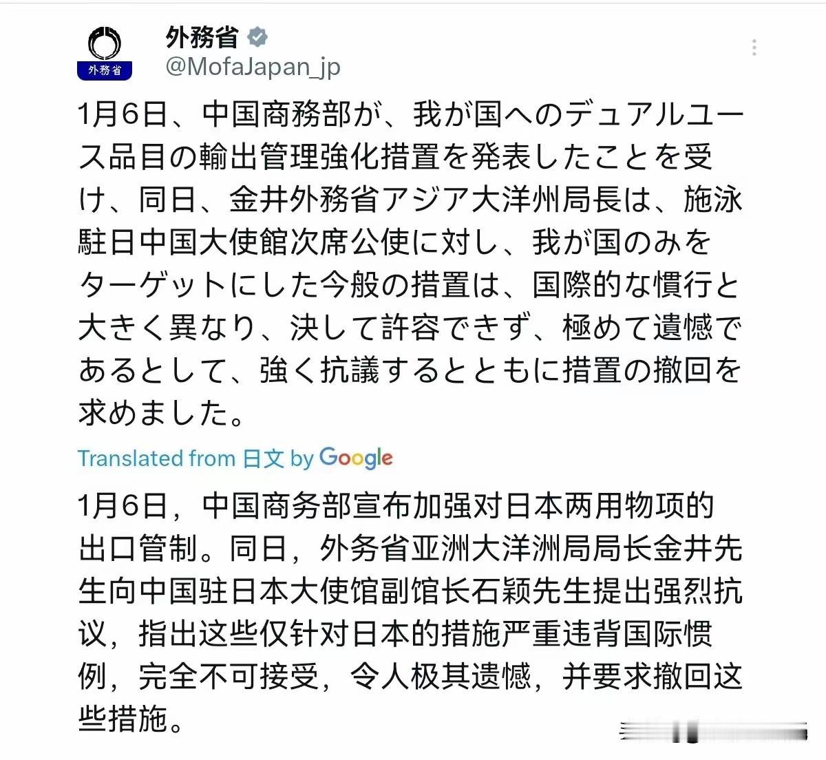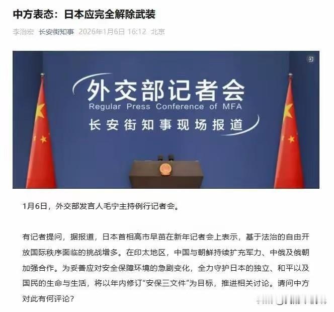 掐死穴!新年伊始中方一剑封死日本军工命门!小日子不再装死出来抗议,还要求中方撤回反制! 当日本公然修订“安保三文件”加速军事松绑之时,中国的反制来得快、准、狠。商务部一纸禁令,全面切断所有两用物项对日本军事用户的出口。这不是普通贸易限制,而是精确打击——直插日本军工产业链的死穴。 日本外务省慌忙跳脚“强烈抗议”,却绝口不提自身背弃和平宪法的危险动向。中国外交部反击堪称教科书级别:白纸黑字搬出《开罗宣言》《波茨坦公告》,直指日本依据国际法“应完全解除武装”。历史法理,双刀封喉。 回望二战,美国对日制裁换来珍珠港的硝烟,最终以两颗原子弹终结疯狂。历史从不重复,但总押着相似的韵脚:穷兵黩武者,终将被反噬。 今日中国不是昔年美国,但维护战后秩序、反制军国复活的决心同样坚决。这一记精准点穴,既是警告,也是划界——红线之上,寸土不让!